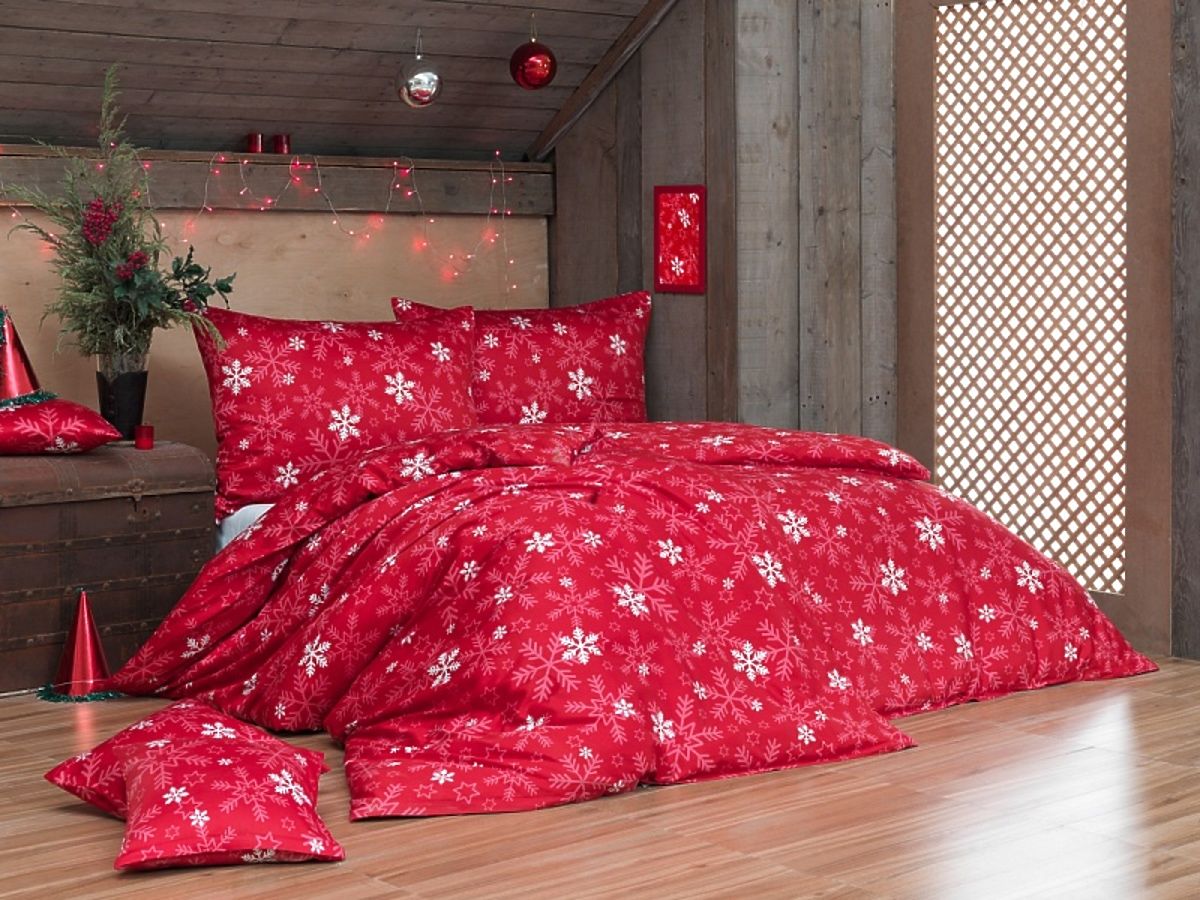Un model festiv cu fulgi de zăpadă vă aduce această lenjerie de pat din bumbac din gama Mateiovsky. Un glob de Crăciun bogat în culoare roșie îmbunătățește motivul cu fulgi de zăpadă.
