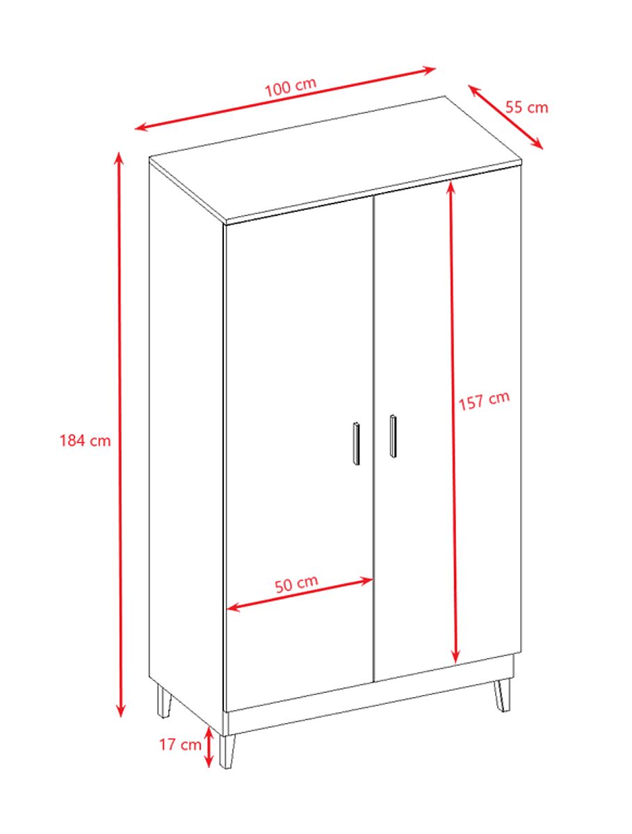 Dulapul cu două uși conține 5 rafturi spațioase , care sunt dispuse în așa fel încât să fie loc și pentru o bară de haine pentru agățat umerase cu haine. Mânerele ergonomice sunt elegante și, împreună cu sistemul de închidere silențioasă, vă îmbunătățesc senzația de utilizare zilnică a acestui dulap.