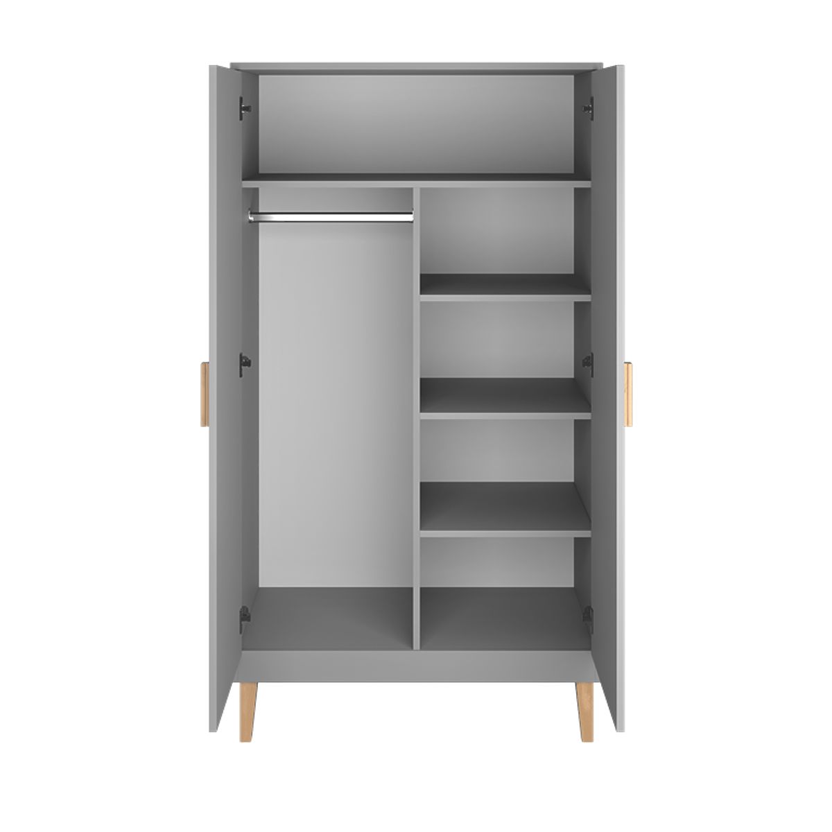 Dulap KUBI modern, gri, pe picioare din lemn masiv de stejar. Cu designul său, garderoba se potrivește cu camerele de copii mobilate în stil scandinav. Este potrivit pentru camerele copiilor de orice varsta, pentru baieti si fete.