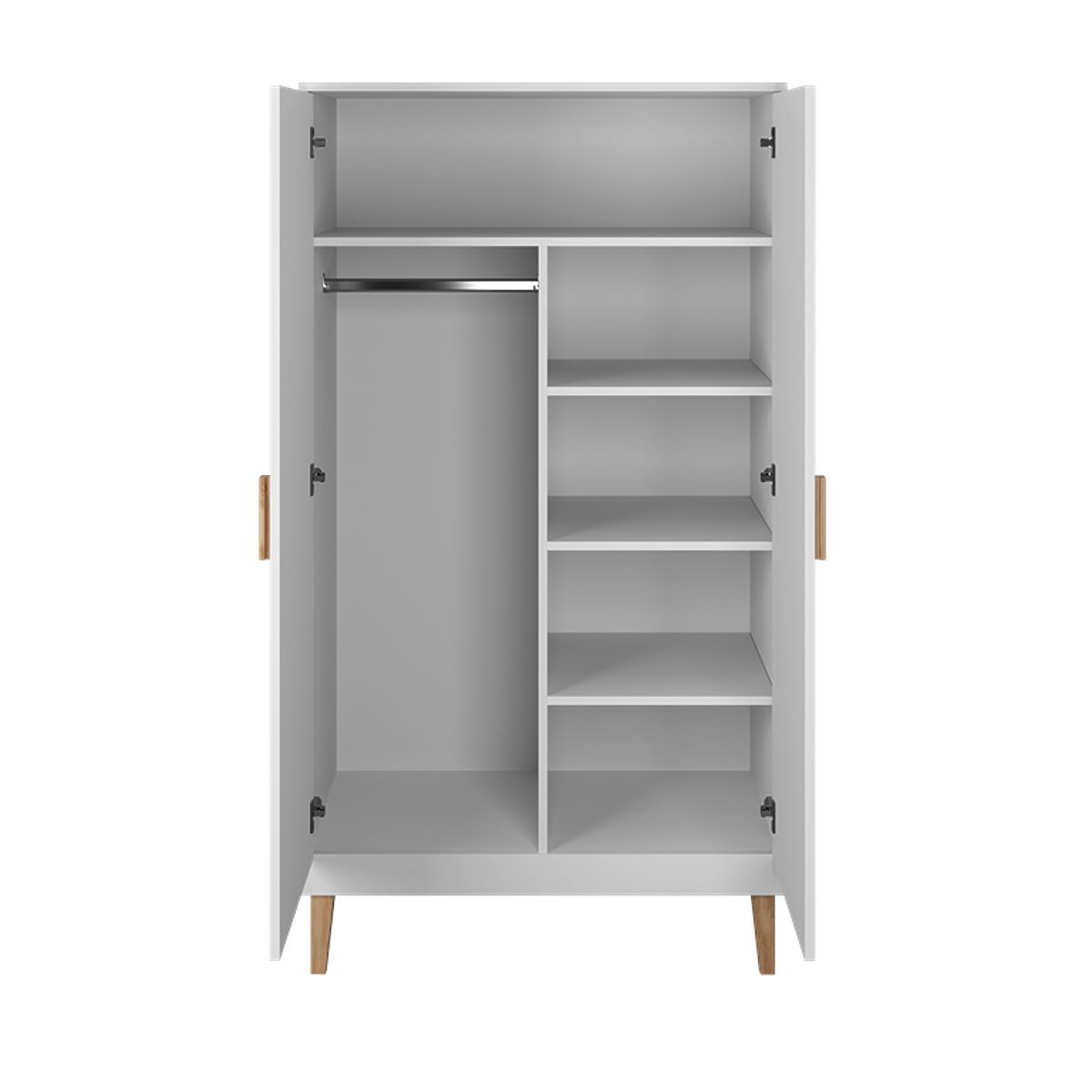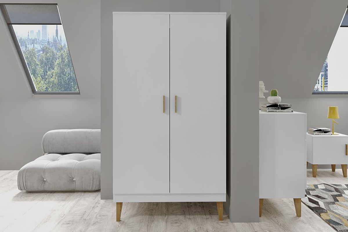 Dulapul cu două uși KUBI, de culoare albă ca zăpada, este fabricat din placă de mobilier de înaltă calitate. Picioarele din stejar masiv accentuează perfect stilul scandinav modern, pe care îl puteți asorta cu ușurință la orice interior.