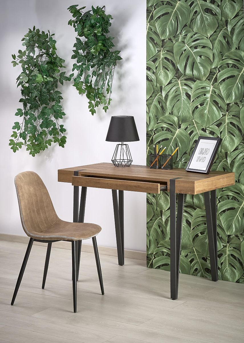 Blatul de lucru este realizat din MDF laminat în culoarea nucii de miere. Structura este realizată din oțel vopsit cu pulbere de culoare neagră.