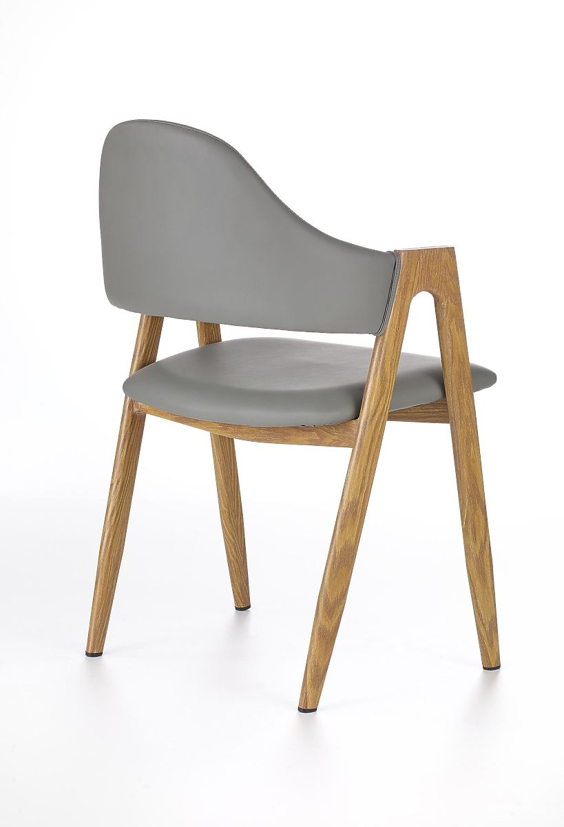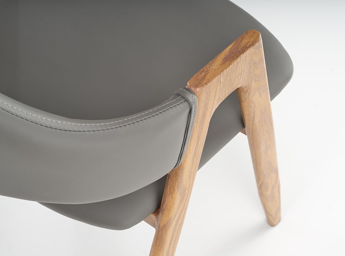 Scaunul este tapițat cu piele ecologică de culoare gri. Structura este realizată din oțel lăcuit în culoarea stejarului miere.