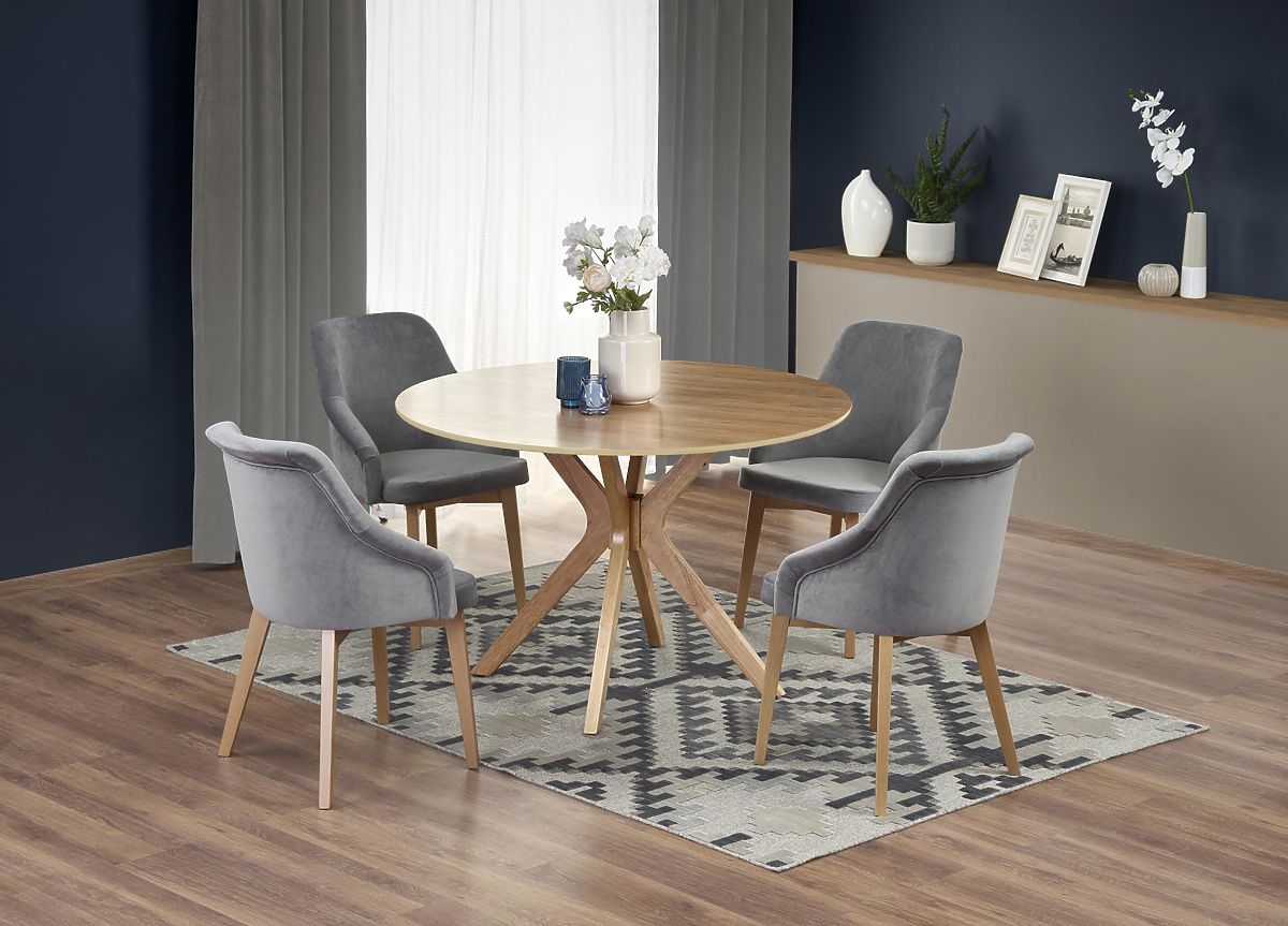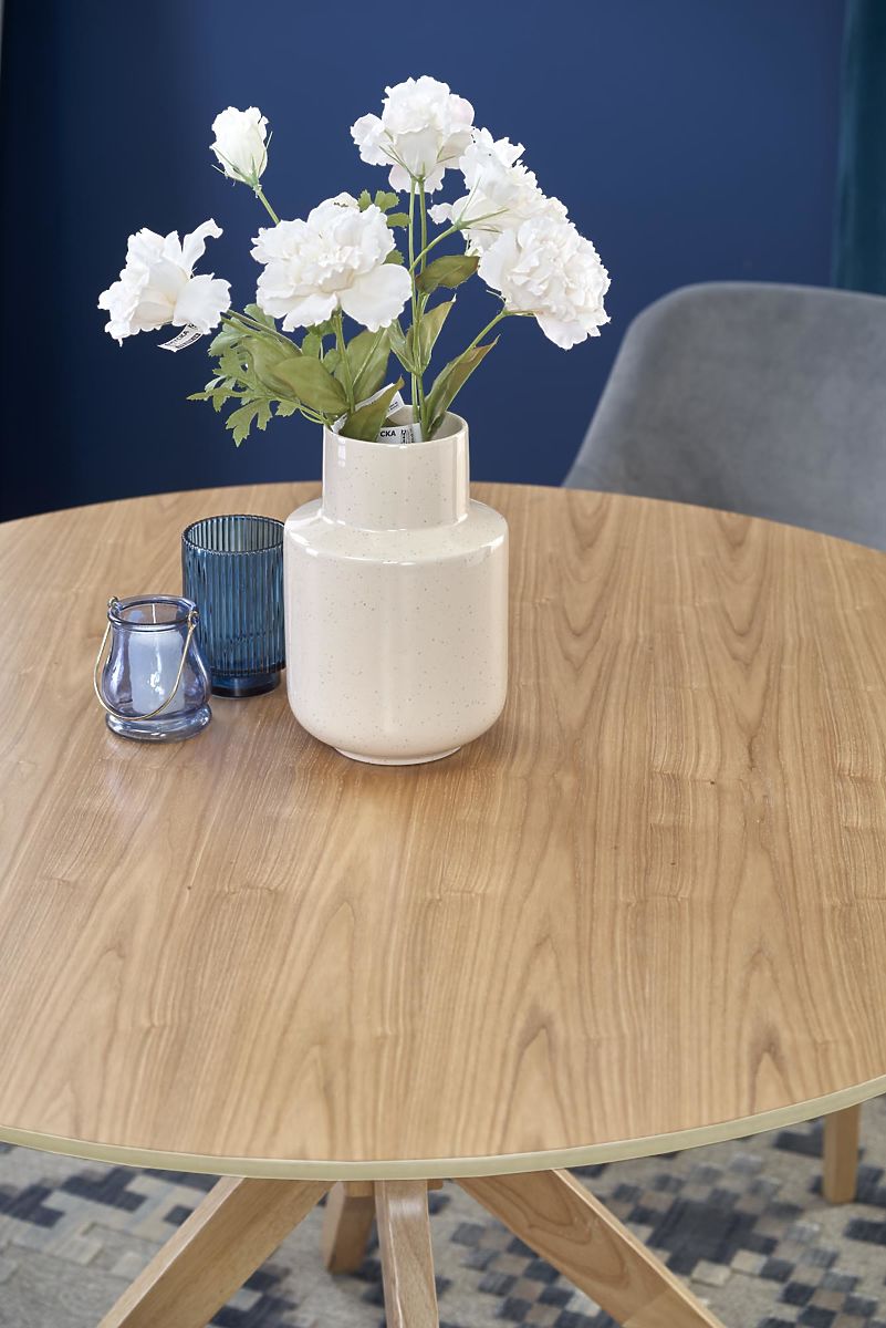 Blatul mesei este realizat din MDF cu furnir natural. Picioarele mesei sunt din lemn masiv.