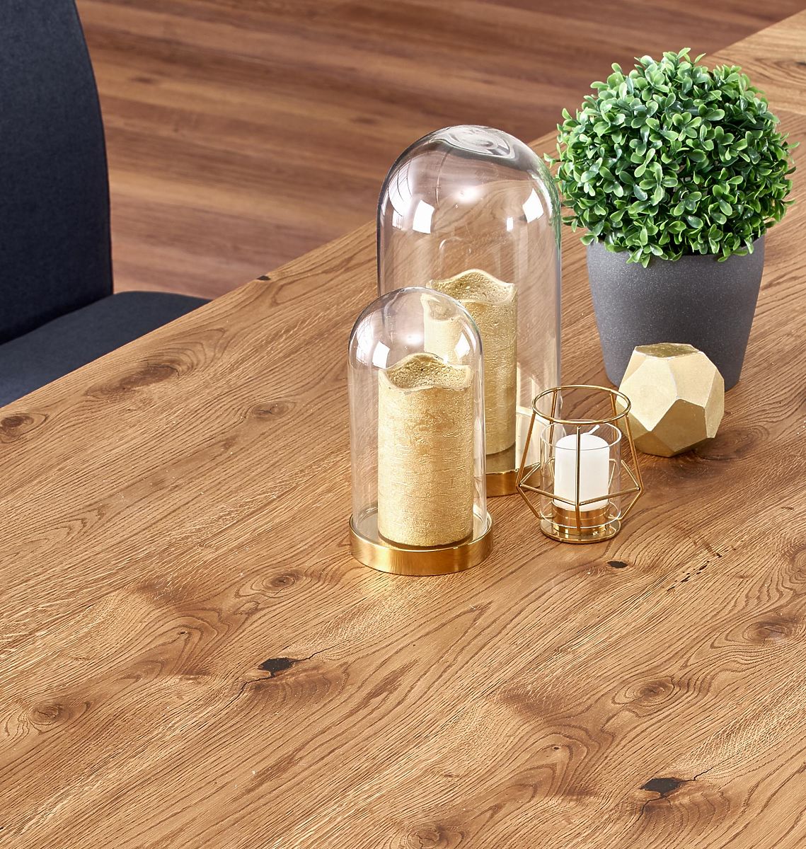 Blatul mesei este fabricat din MDF laminat și furniruit robust, cu margini din lemn masiv de culoare stejar deschis.