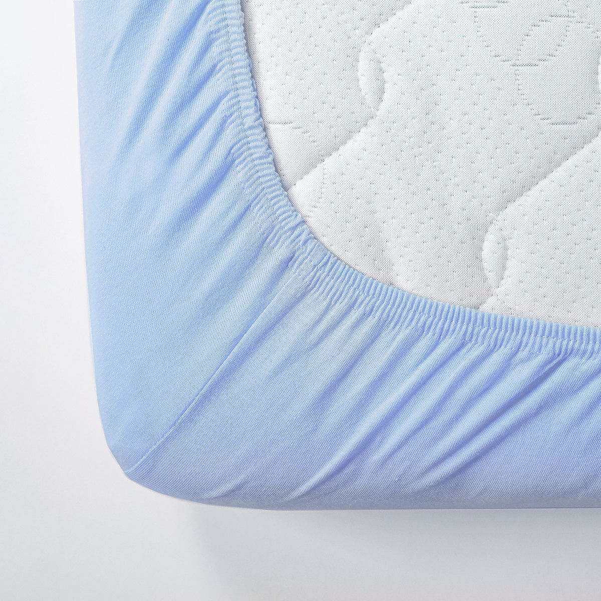 Cearceaf de pat din bumbac de culoare albastru deschis. Cearceaful este țesut din fire de bumbac de înaltă calitate, motiv pentru care își păstrează proprietățile chiar și după spălări repetate.