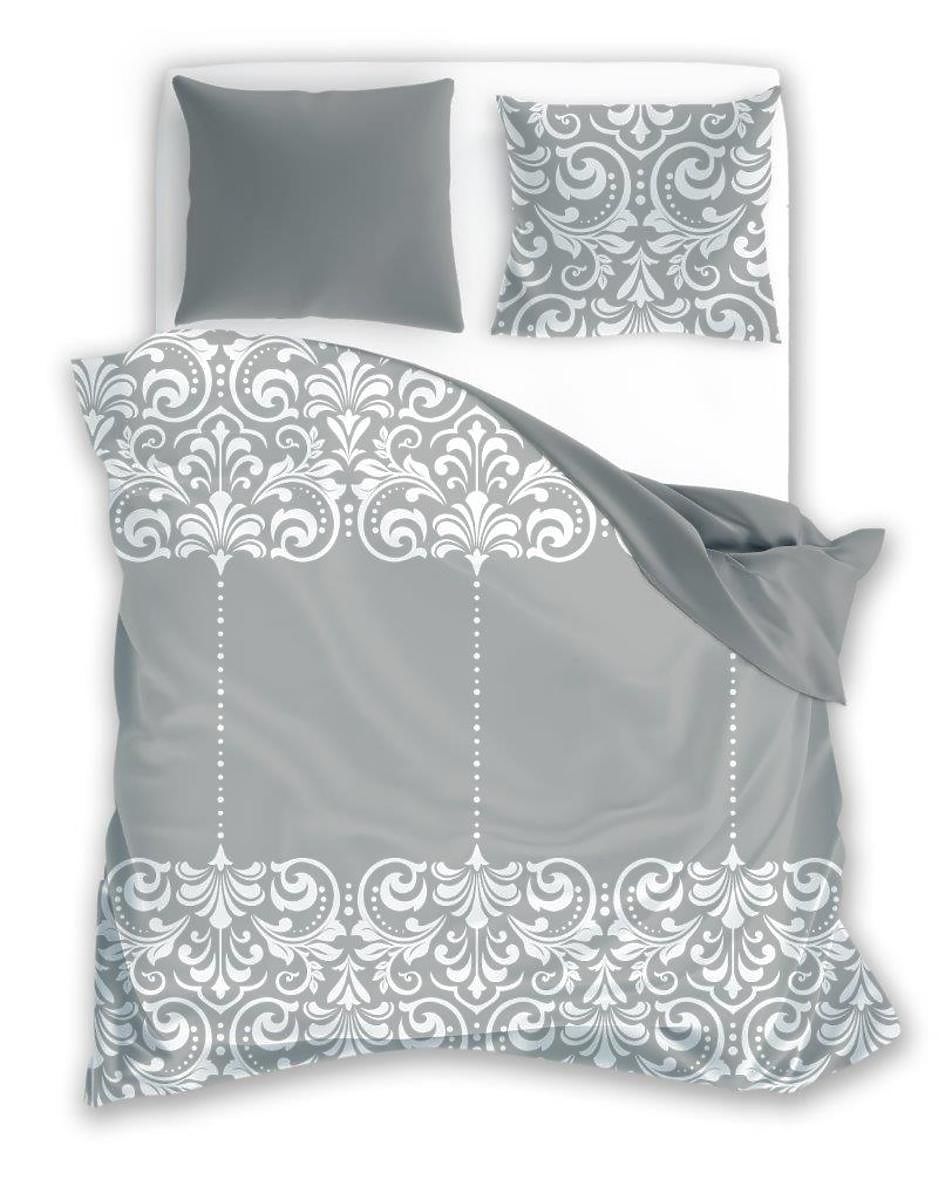 Lenjeria de pat este compusă dintr -o husă de pilota de 140 x 200 cm și o față de pernă de 70 x 90 cm . Este față-verso , unde pe față culoarea de fundal este gri și pe ea ies în evidență ornamente albe imprimate în dungi orizontale. Cealaltă parte a lenjeriei de pat este gri.