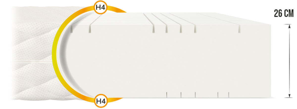 Datorită saltelei din spumă Goya Max Plus de înaltă calitate, cu o înălțime de 26 cm, somnul tău va fi cea mai plăcută parte a zilei. Salteaua cu două fețe este împărțită în 7 zone datorită unei serii de tăieturi transversale și longitudinale. Ca rezultat, a fost obținută o creștere semnificativă a plasticității, ceea ce oferă un sprijin excelent pentru coloana vertebrală .