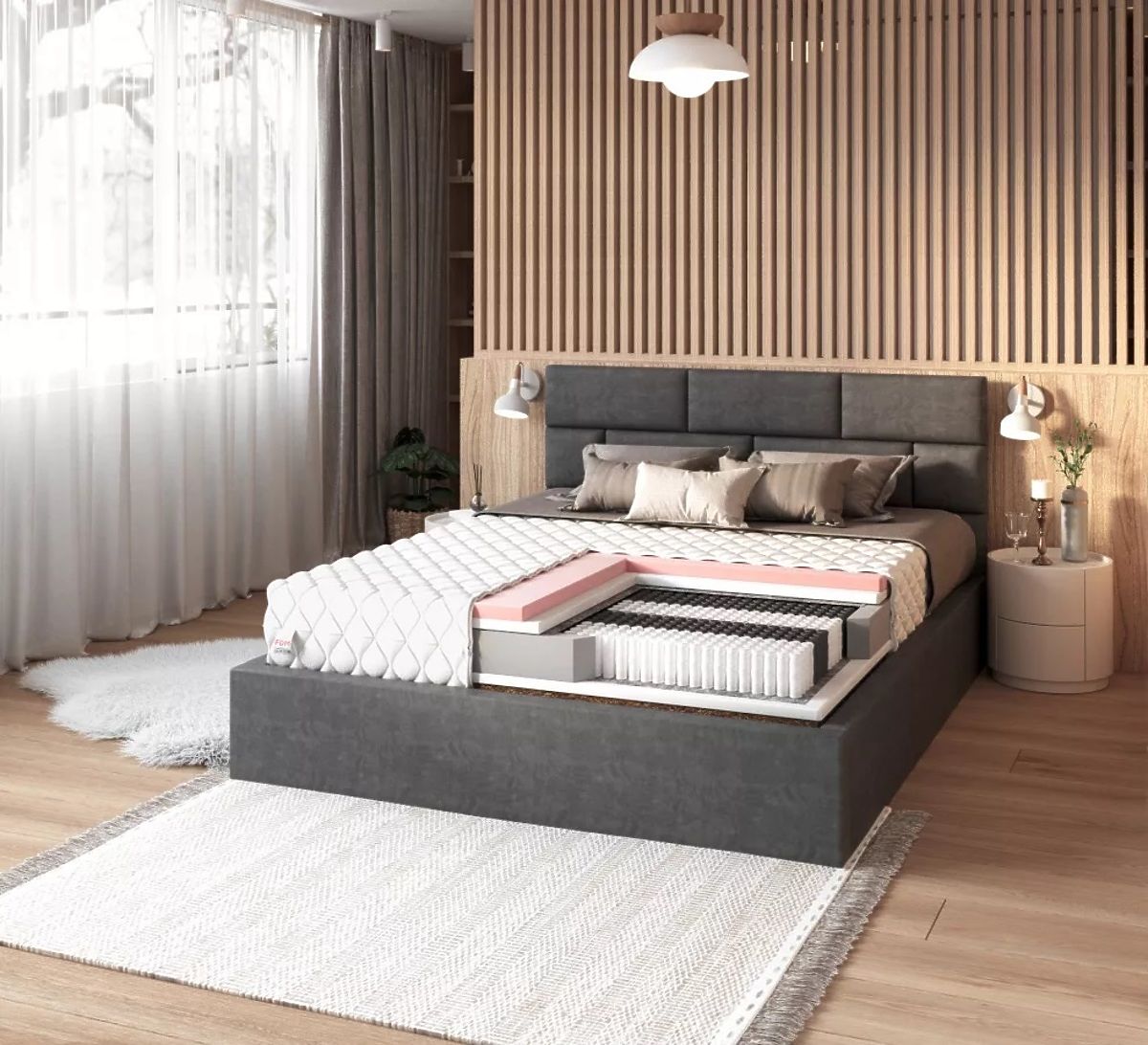 Salteaua IVREA are o înălțime de 22 cm și vă oferă un design cu două fețe, cu o parte tare și una mai moale, astfel încât să puteți dormi după bunul plac. Salteaua este compusă din mai multe straturi diferite, pe bază de arcuri cu buzunare cu 7 zone de susținere a corpului. Acest lucru vă asigură că fiecare parte a corpului dvs. va avea un confort total în timp ce dormiți. În plus, aceasta reduce disconfortul rezultat din mișcările celeilalte persoane și asigură astfel un somn profund neîntrerupt.