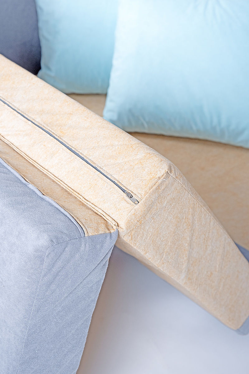 Husa canapelei este din 100% poliester, un material foarte rezistent, ideal pentru camerele copiilor. Părțile laterale și spatele sunt întărite cu o placă de calitate, oferind canapelei un suport stabil. Canapeaua are două perne mari pentru spate și un șezut confortabil.