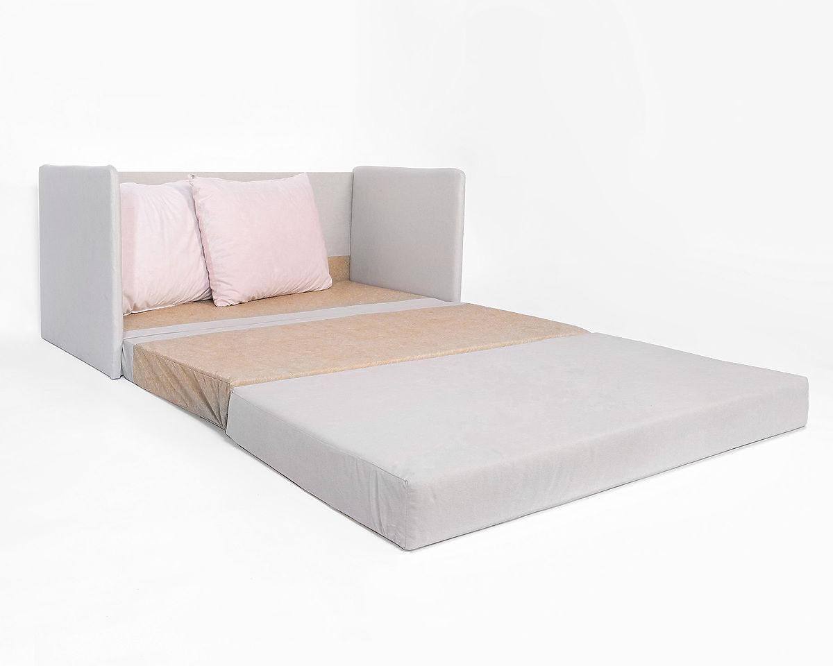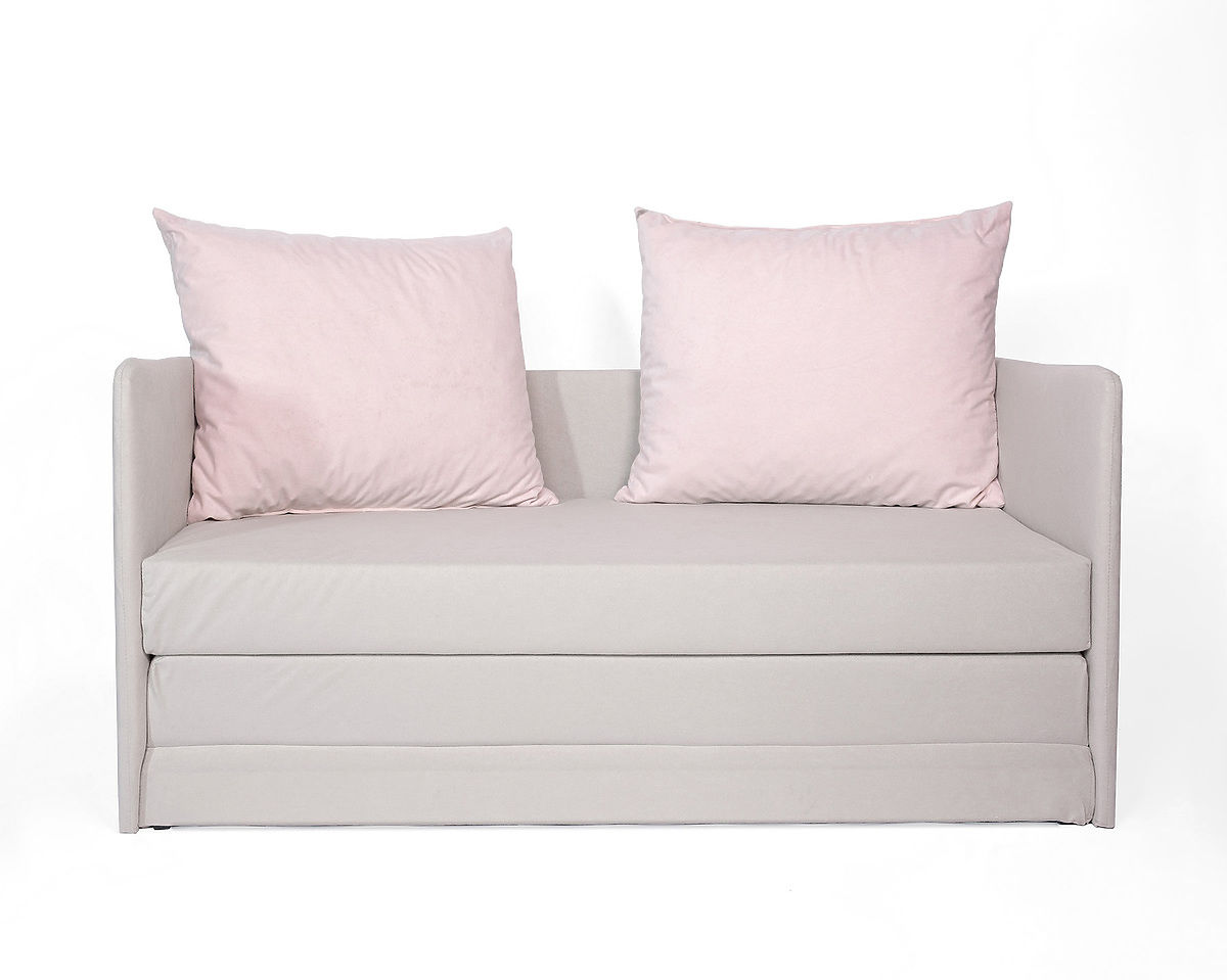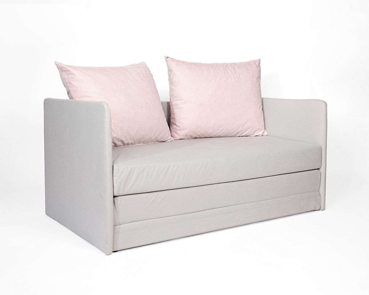 O canapea gri deschis Jack frumoasă și foarte practică, cu perne roz pudră, se va potrivi în toate camerele fetelor.