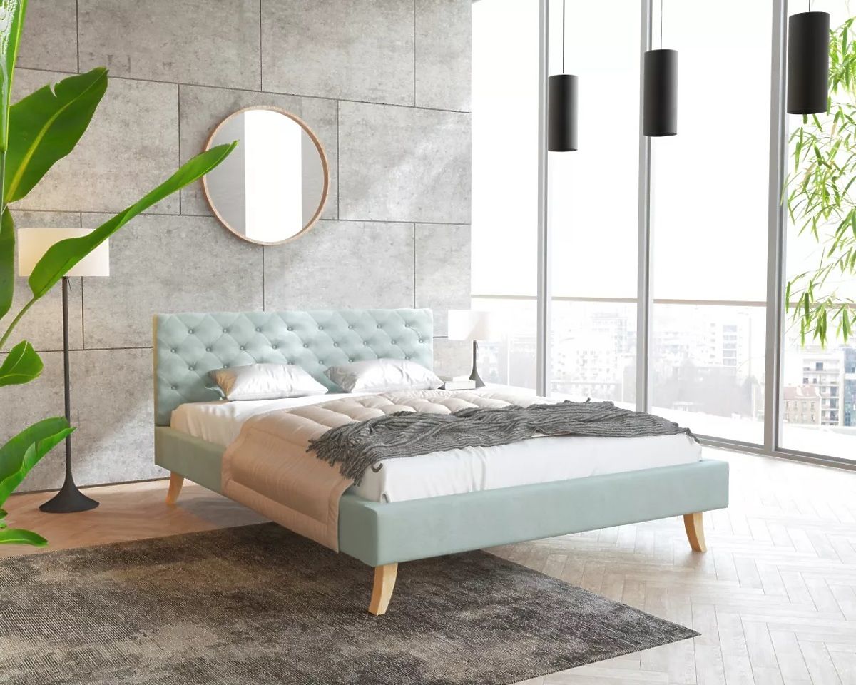 Materialul de tapițerie al patului de tapițerie este stofă velur Trinity de culoare mentă. Se caracterizează printr-o structură fină și, în același timp, o rezistență ridicată chiar și la lumina soarelui. Este moale, pufoasă și plăcută la atingere. De asemenea, este foarte rezistentă la uzură și scămoșare. Vă va atrage atenția prin aspectul său modern și cusăturile decorative ale tăbliei patului.