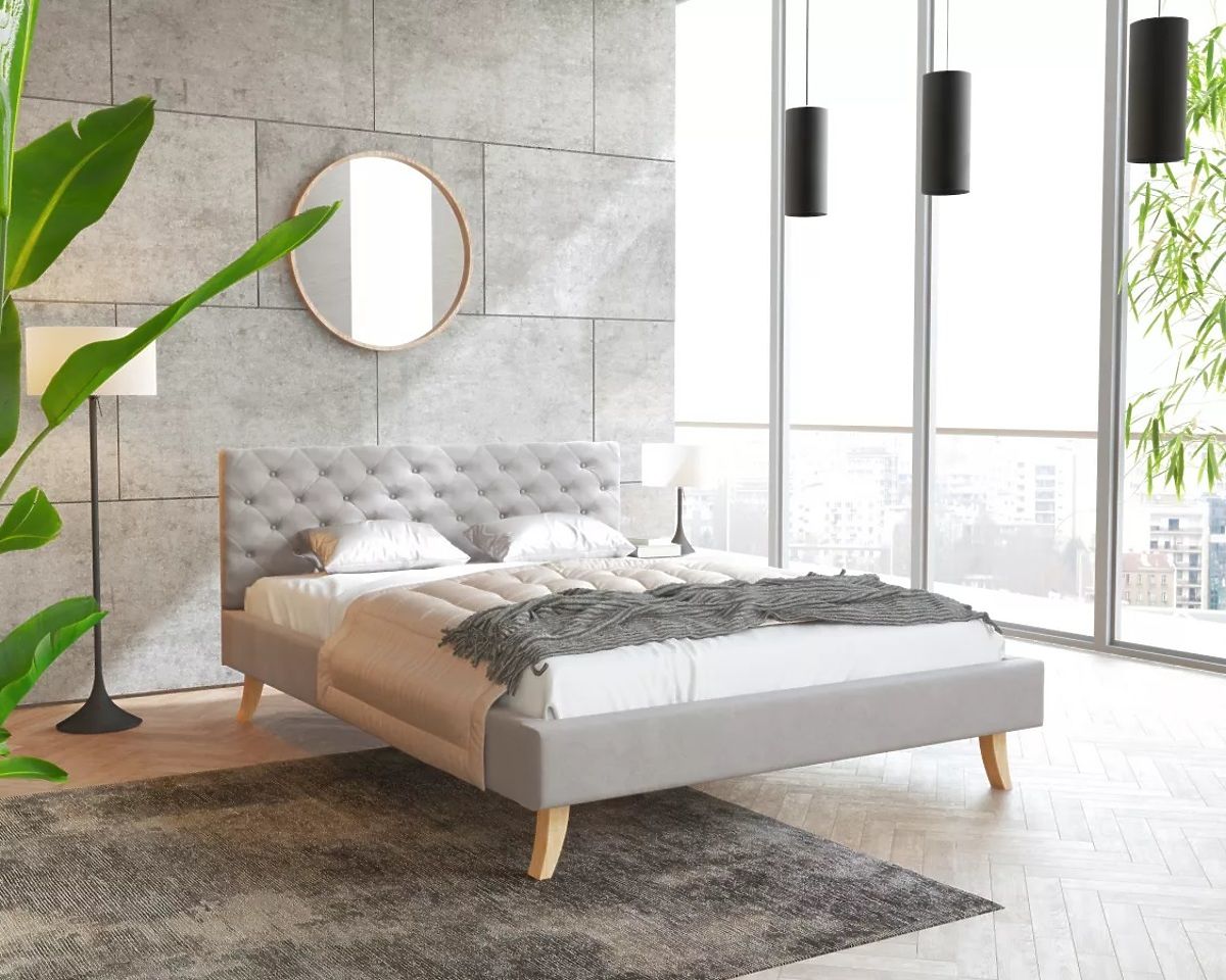 Materialul de acoperire al patului tapitat este țesătură velur gri Trinity . Se caracterizeaza printr-o structura fina si in acelasi timp rezistenta ridicata la lumina soarelui. Este moale, pufos și plăcut la atingere . De asemenea, este foarte rezistent la abraziune și pilling. Te va impresiona prin aspectul modern și cusăturile decorative de pe capul patului.