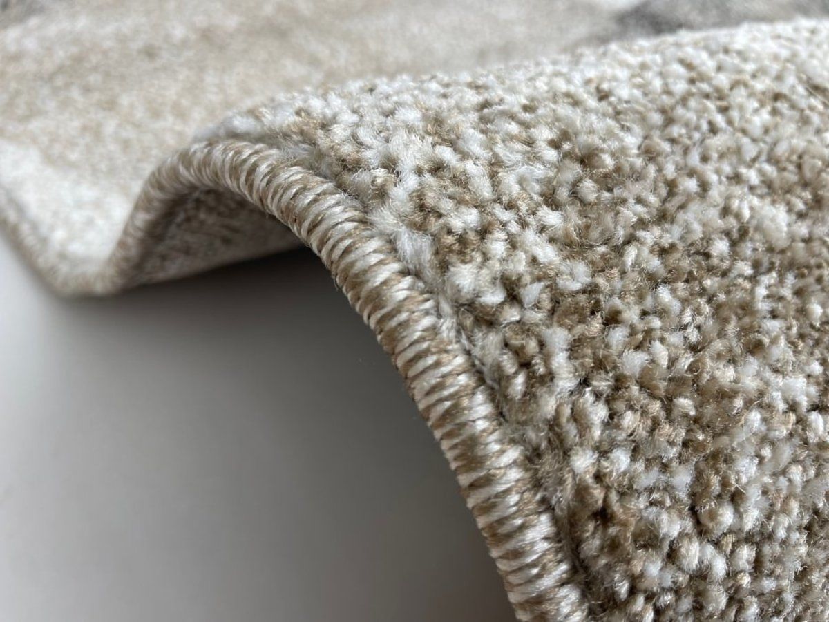 Covorul aspect in nuanta bej este realizat 100% din fibra de polipropilena tip frisé, care garanteaza o suprafata placuta . Părul său dens are 12 mm înălțime. Este prevazuta cu tratament antistatic si cusaturi chemlon in aceeasi culoare ca si covorul.