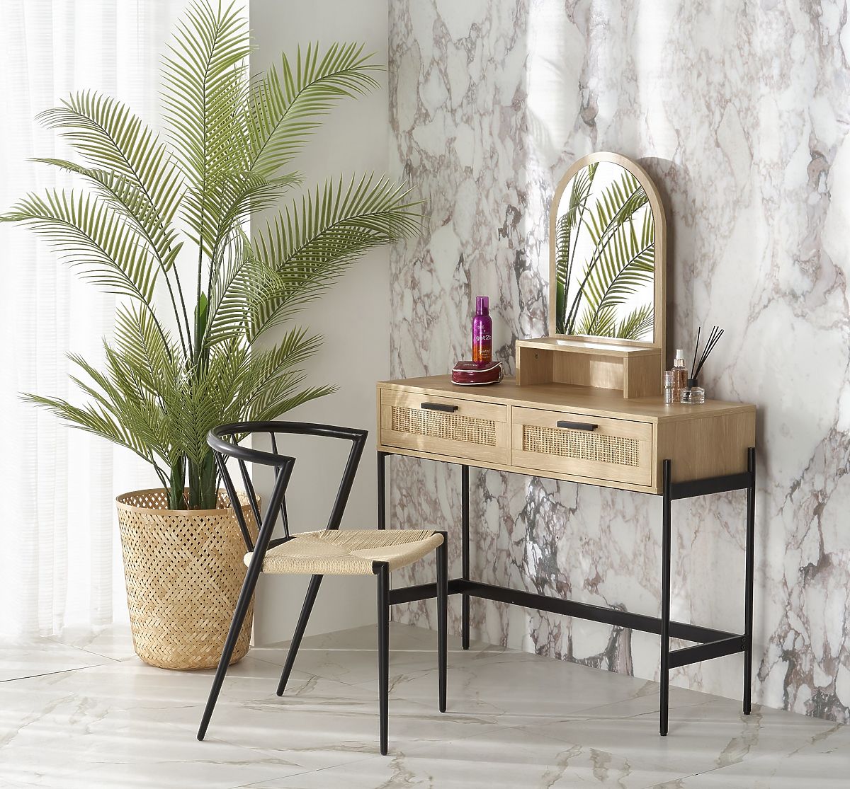 Masa cosmetica Carmen realizata din ratan natural, care aduce nu doar functionalitate, ci si o experienta estetica unica in camera ta de frumusete.