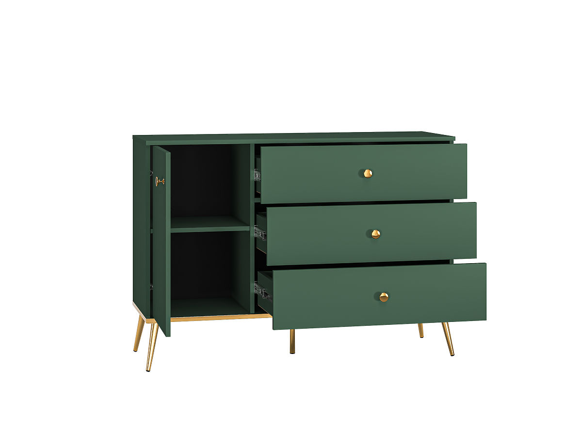 Îmbogățiți-vă interiorul cu o piesă de mobilier unică sub forma unei comode Forest mai mici, care are o impresie simplă, minimalistă, dar, în același timp, cu combinația sa atipică de culori de verde închis și auriu, va aduce eleganță, pace și armonie în casa ta. Se potrivește perfect într-un interior modern, precum și într-un stil retro.