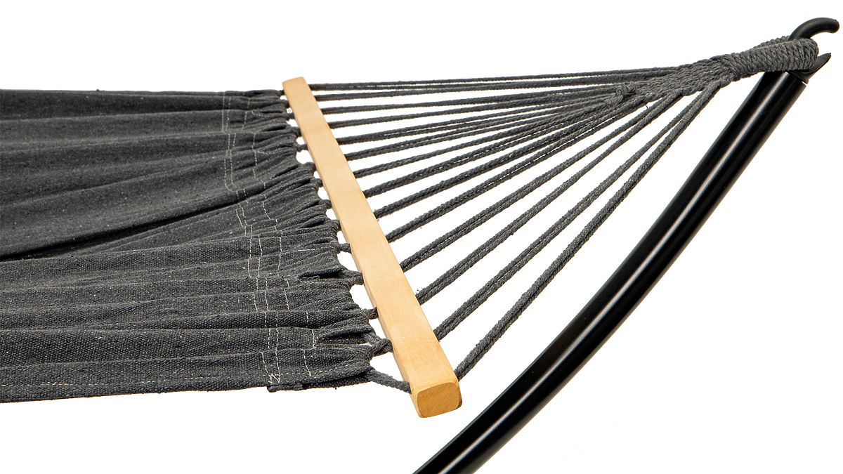 Hamacul este fabricat dintr-un material rezistent care se adaptează perfect corpului. Barele de lemn prin care sunt trecute corzile de fixare asigură că suprafața destinată șezutului este corect întinsă și nu se răsucește.