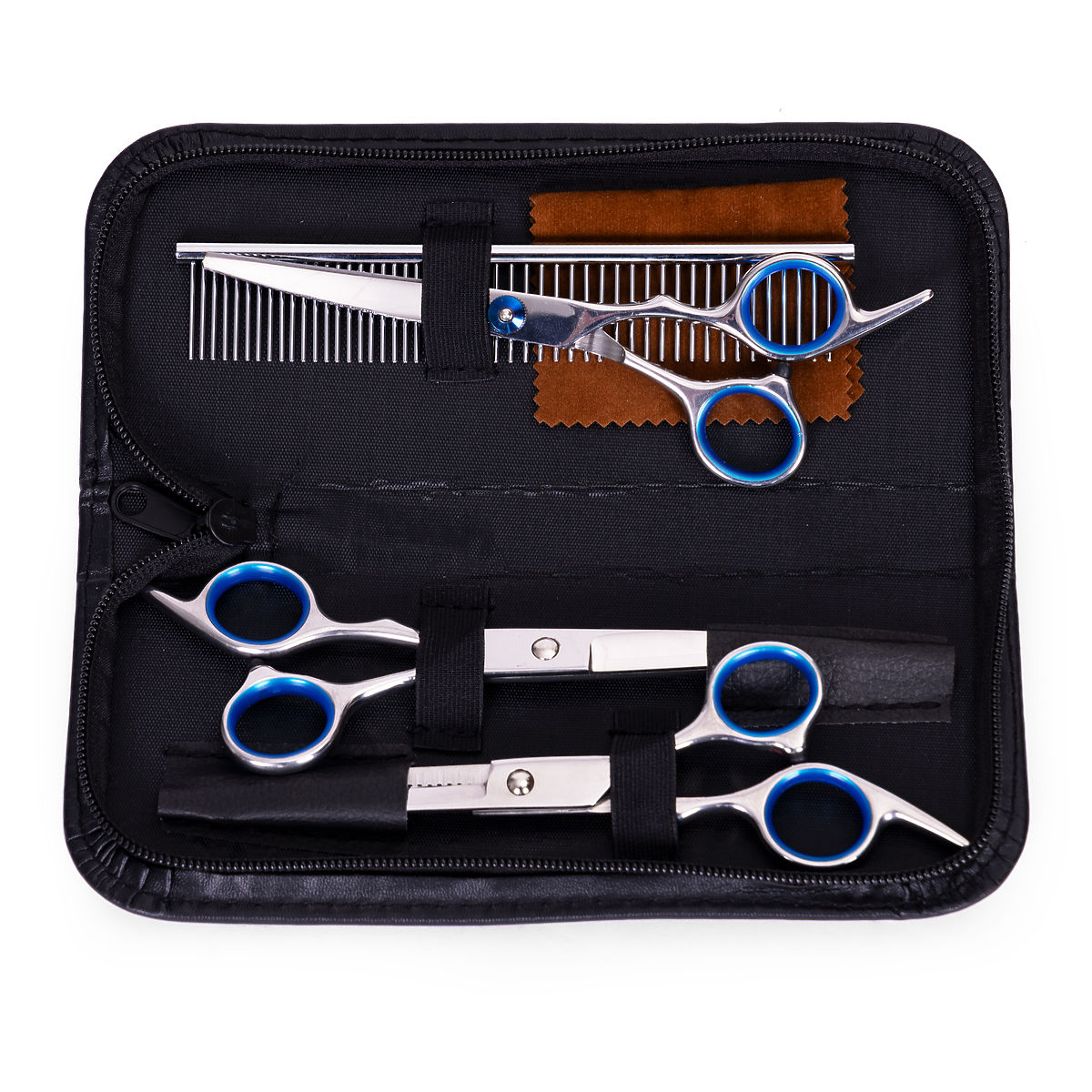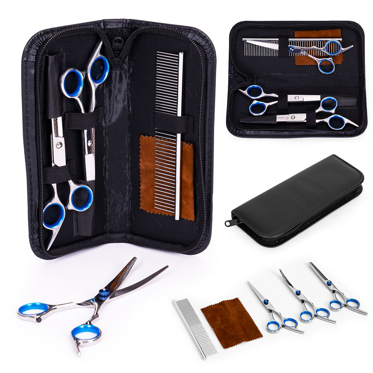 Setul de foarfece a fost creat cu atenție pentru tunsul și îngrijirea sigură a câinilor și pisicilor, asigurând precizie și confort atât pentru proprietari, cât și pentru animalele noastre de companie. Setul conține trei tipuri diferite de foarfece, care pot fi adaptate nevoilor diverse de îngrijire. În plus, setul de îngrijire include un pieptene practic, potrivit atât pentru blana netedă, cât și pentru cea încâlcită, totul ambalat într-o mică husă din piele ecologică.