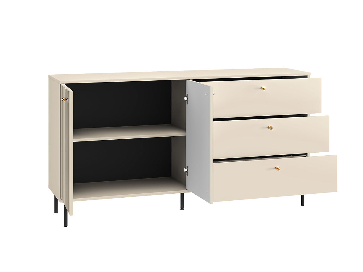Comoda Sophie într-o versiune mai mare este o combinație unică de decor bej deschis cu uși frezate moderne, completate cu mânere elegante aurii și picioare din metal negru. Cu această comodă din materiale de calitate veți obține nu doar o piesă de mobilier practică, ci și un element stilat, care vă va însufleți locuința și îi va oferi o atmosferă confortabilă.