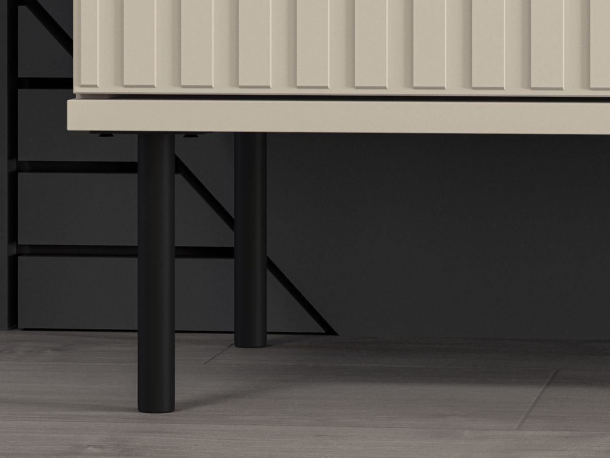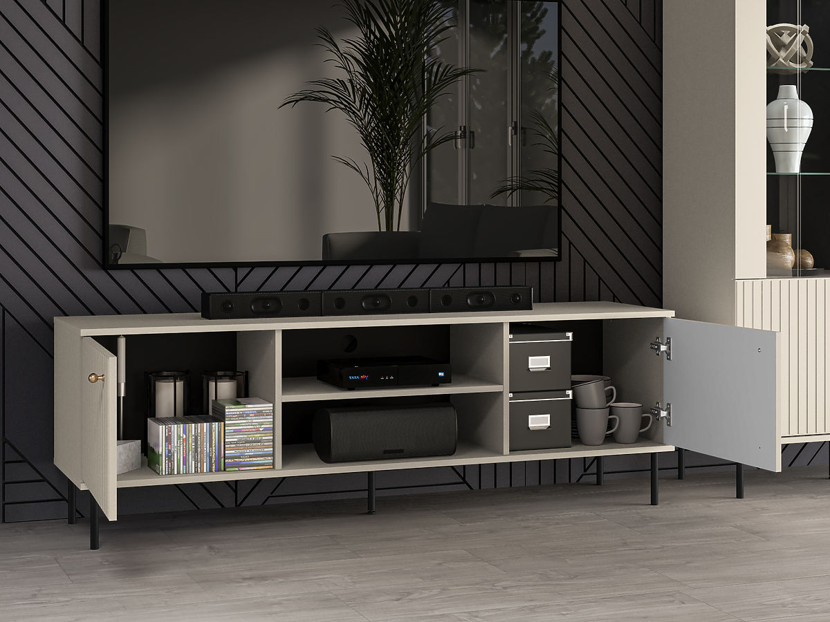 Masa TV Sophie in design bej imbina eleganta, caracterul practic si designul modern. Datorită spațiului mare de depozitare, oferă suficient spațiu pentru diverse dispozitive electronice, cărți sau alte lucruri. Un element interesant al mobilierului este ușa frezată modernă, completată de mânere elegante aurii și picioare din metal negru. Masa TV este un plus excelent pentru camera de zi.