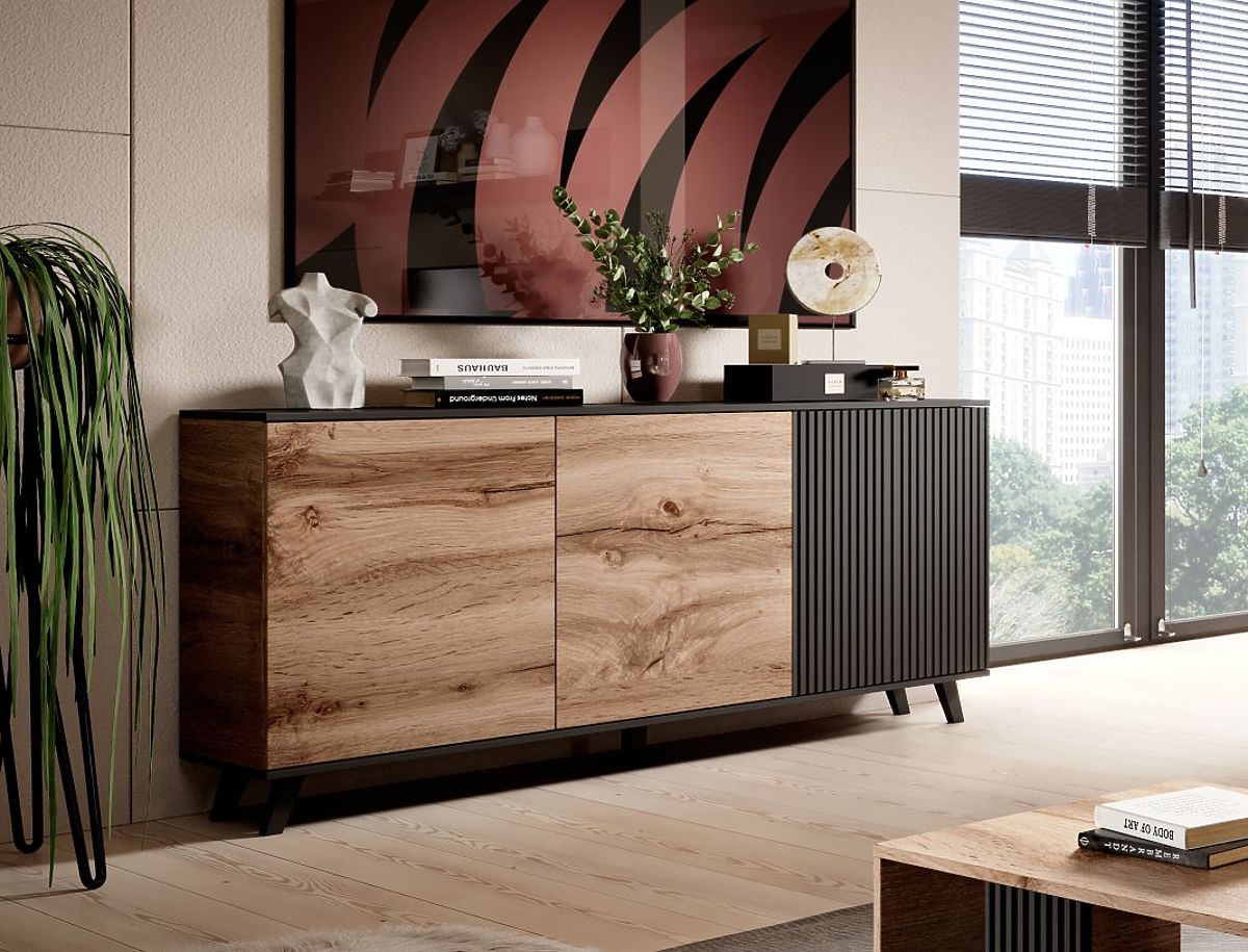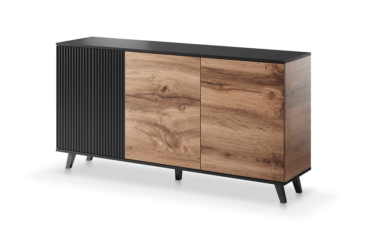 Comodă modernă Stejar Wotan - Negru cu spațiu generos de depozitare. .. mai mult