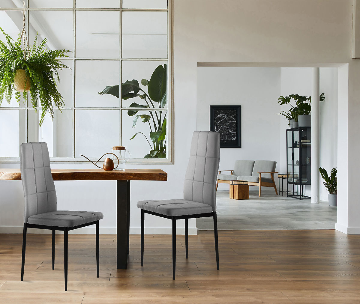 Scaunele se vor potrivi perfect cu masa de familie din sufrageria și bucătăria dumneavoastră. Mobilierul gri cusut, realizat dintr-un material plăcut la atingere, se potrivește în orice interior și îi oferă un farmec aparte.