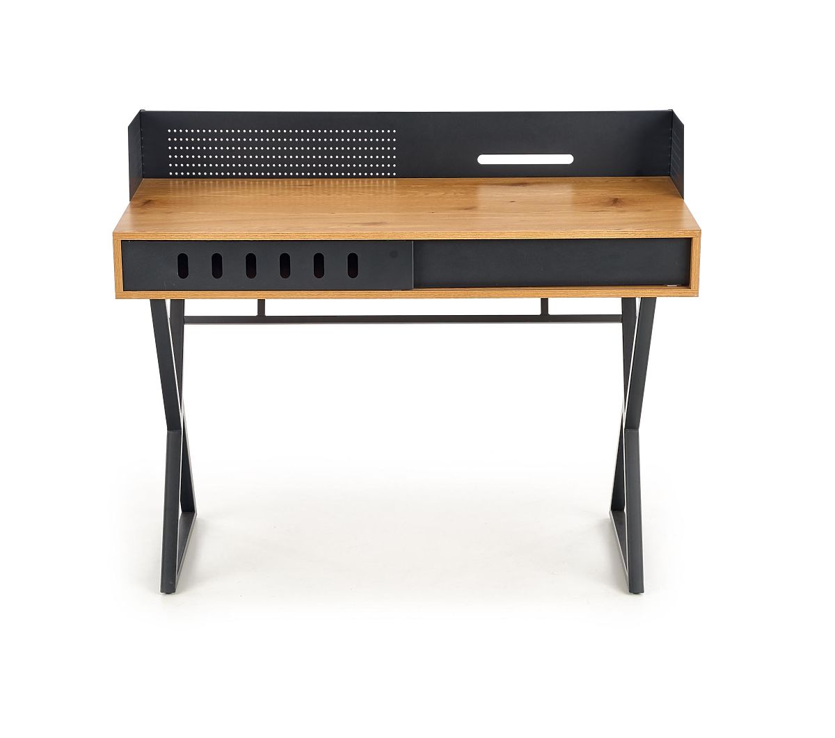 Birou modern cu un design elegant, care combină stejarul auriu și culoarea neagră. Este fabricat din MDF furniruit și oțel vopsit în câmp electrostatic, asigurând o calitate și durabilitate ridicată. Ideal pentru biroul de acasă sau colțul de lucru.