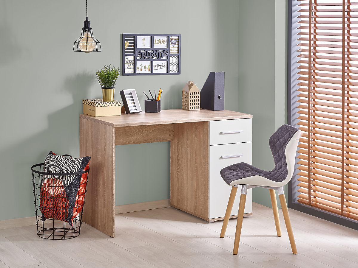 Birou stilat în culoarea stejar sonoma/alb, care combină aspectul modern cu caracteristicile practice. Fabricat din placă de mobilier laminată cu margini ABS, este ideal pentru muncă eficientă și organizare.