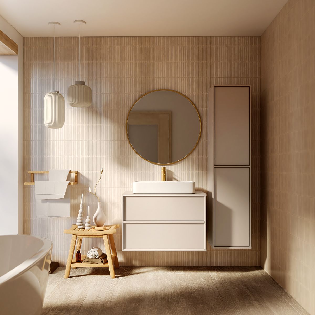 Coloană de baie Mossy cu finisaj de cașmir și soluții practice. .. mai mult