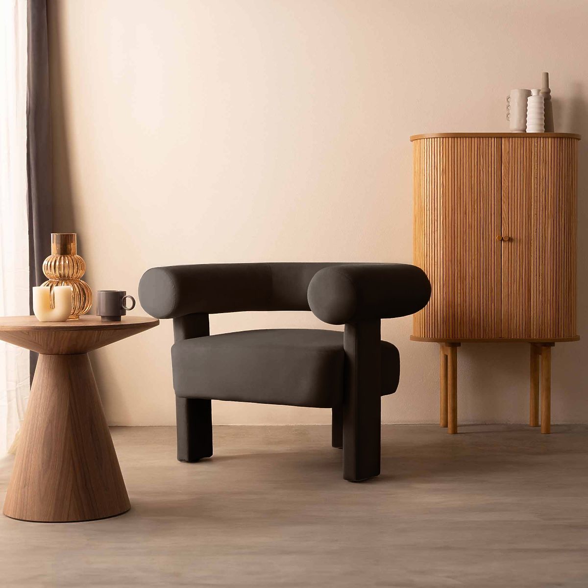 Fotoliu de relaxare Hella maro, catifea, rotunjit pentru confort și stil. .. mai mult