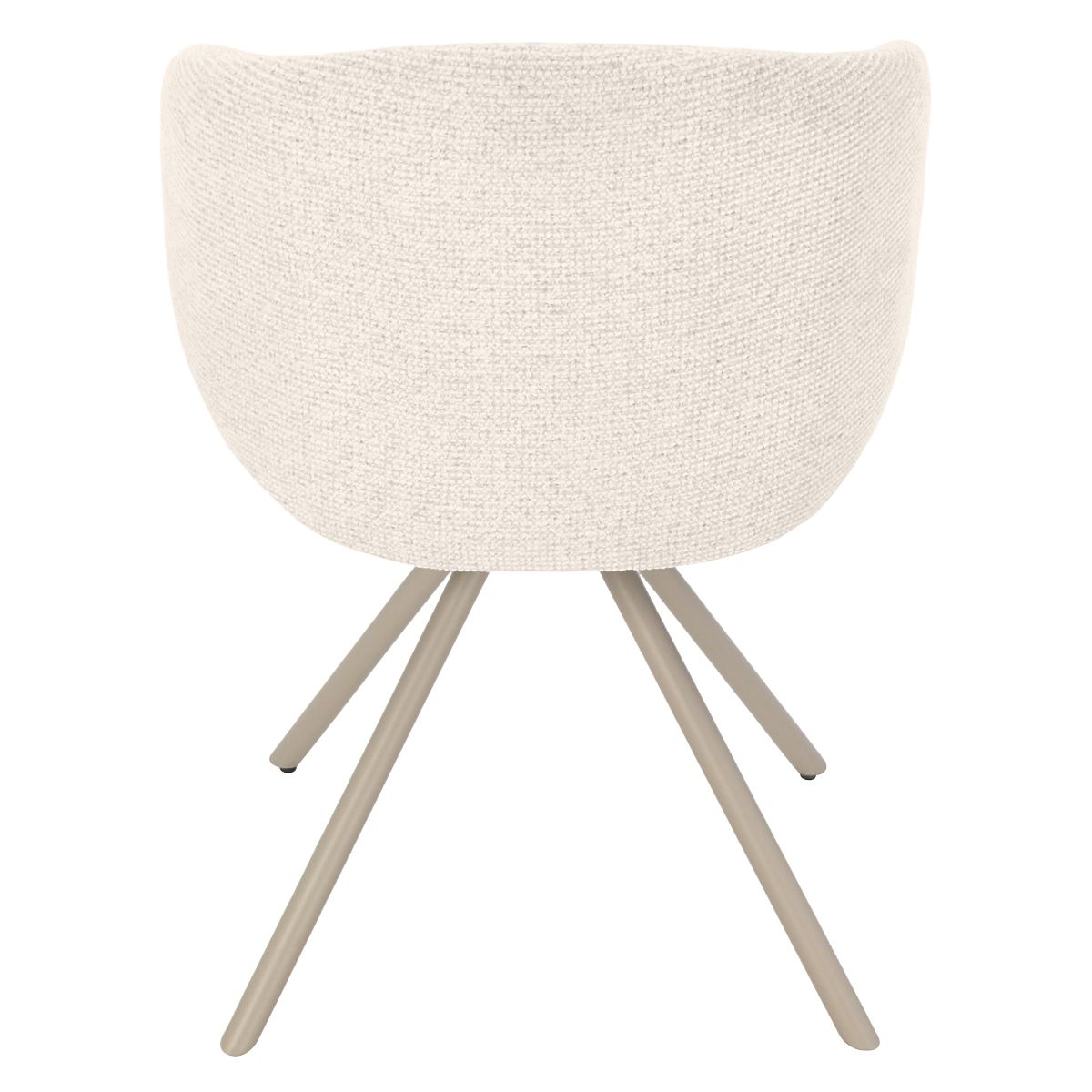 Forma unică a brațelor și designul fluid conferă scaunului lejeritate și eleganță, atrăgând privirile. Baza metalică stabilă, cu patru brațe, în culoarea bej completează armonios ansamblul și garantează durabilitate și robustețe.