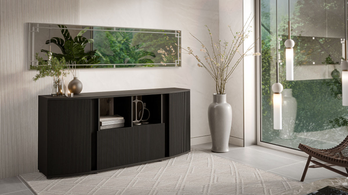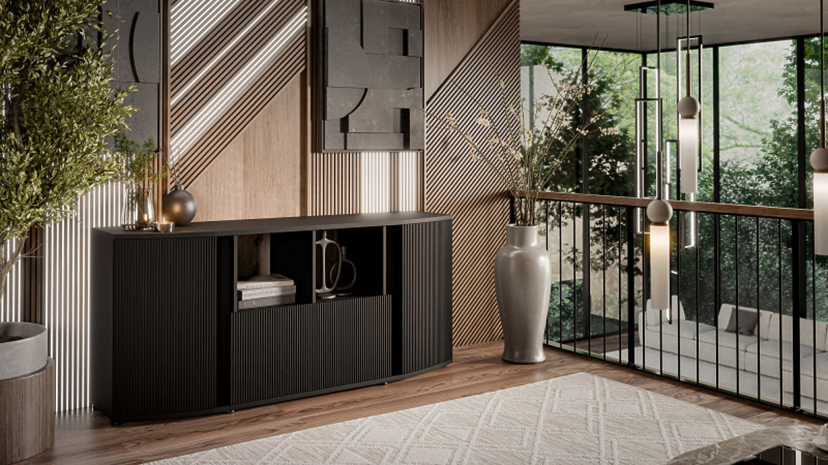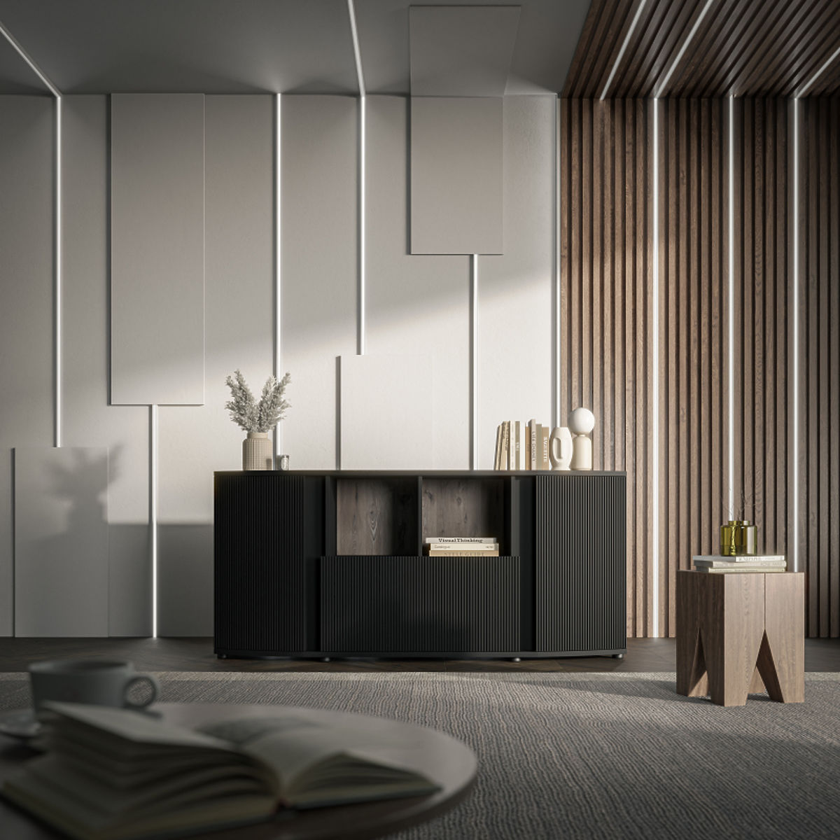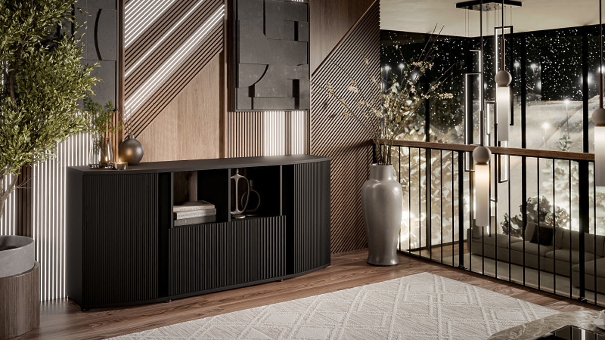 Comodă negru/stejar viking cu frezări vizibile. .. mai mult