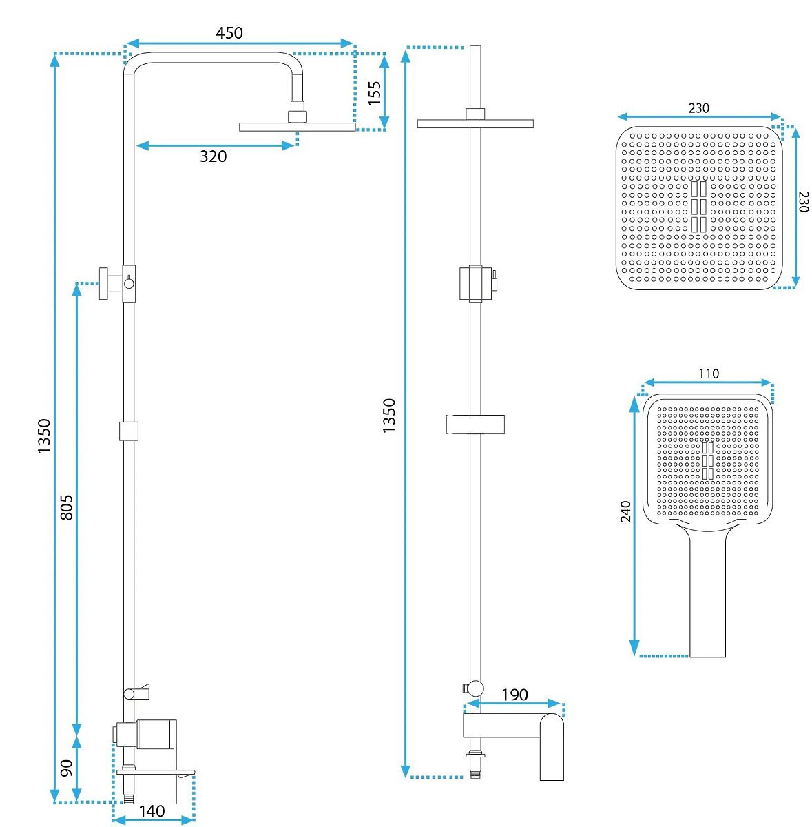 Setul de duș include un duș de ploaie cu diametrul de 20 cm, un telefon de duș cu jet reglabil și un suport de perete confortabil. Înălțimea setului este de 110 cm și se potrivește în majoritatea cabinelor și nișelor de duș.