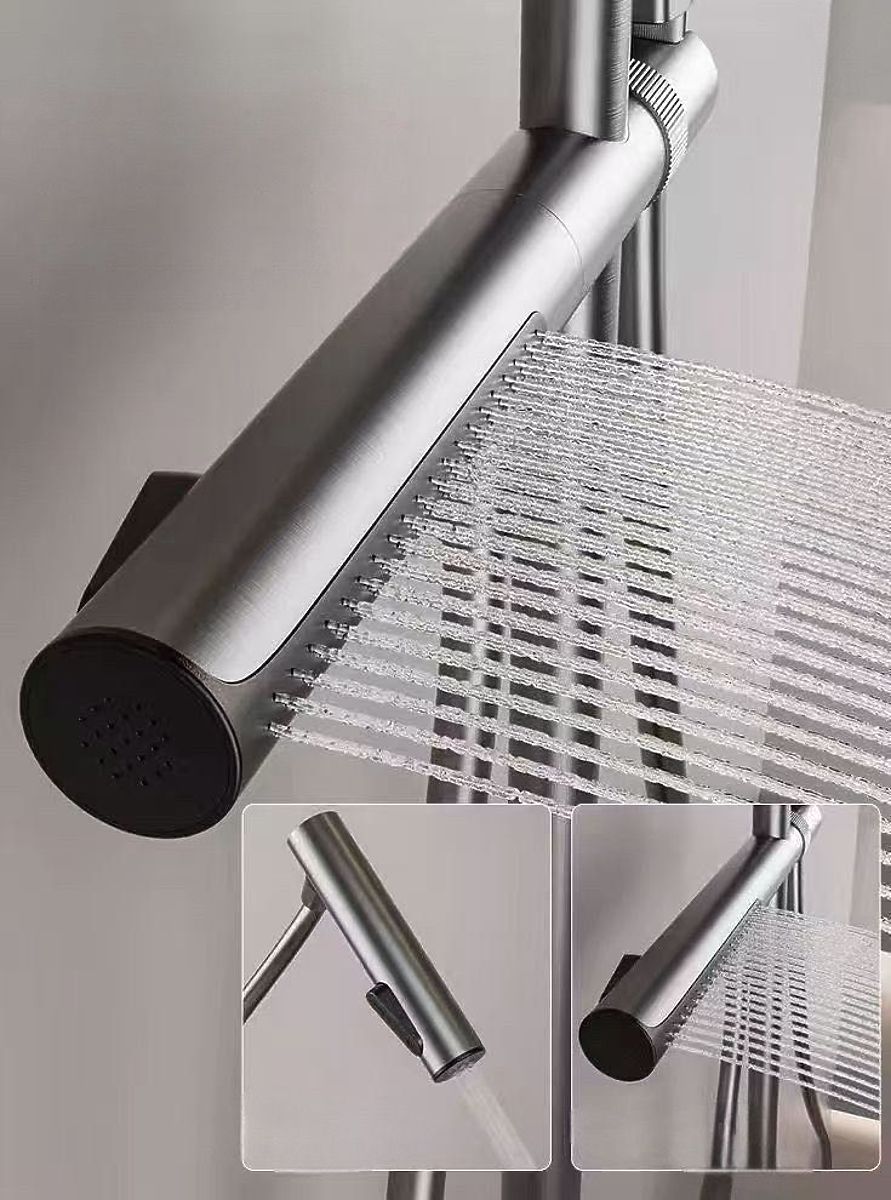 O atenție deosebită merită funcționalitatea extinsă: în suportul setului este integrată o dușă extractibilă, cu două funcții, cu flux de apă în cascadă și lateral, care poate servi ca un bideu practic. În plus, setul include un cap de duș clasic cu aspect modern - echipat cu un comutator de flux de apă și un duș de ploaie.