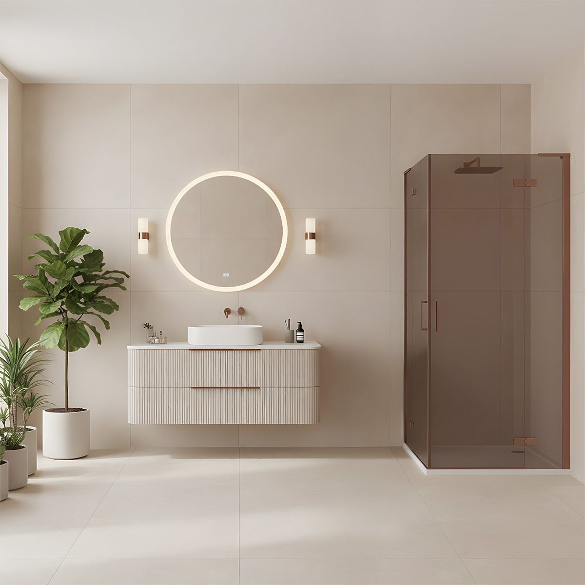 Cabina de duș Hugo Double este o soluție modernă care îmbină eleganța și funcționalitatea. Este fabricată din sticlă securizată, fumurie, de culoare maro și finisată cu profile de culoare cupru periat, ceea ce reprezintă un element deosebit pentru orice baie, subliniind caracterul său luxos.
