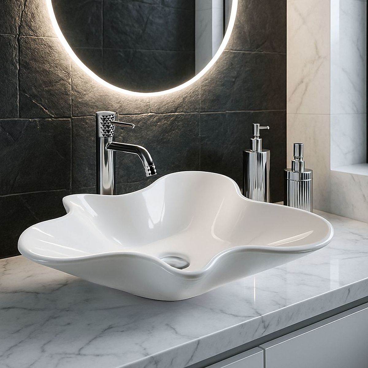 Lavoarul deasupra blatului Izolda este o alegere excepțională pentru cei care apreciază designul modern și formele unice. Forma sa neregulată, inspirată de liniile naturale, îl transformă într-un element decorativ de efect, care va schimba caracterul oricărei băi.