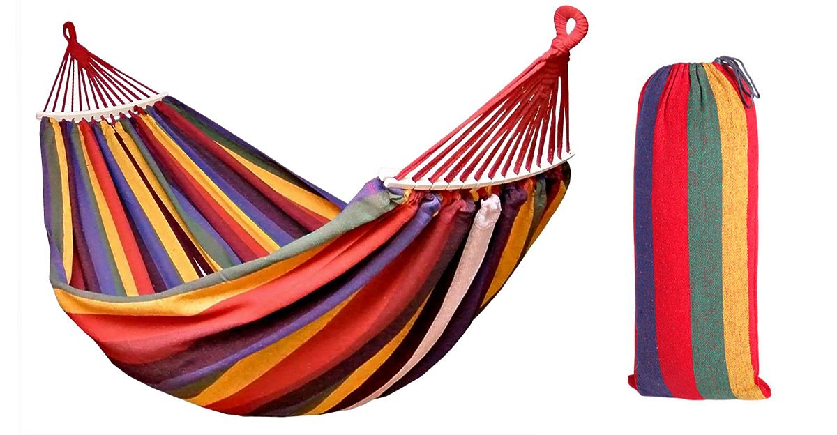 Hamac galben cu bară de distanțare, ideal pentru grădină sau terasă. .. mai mult