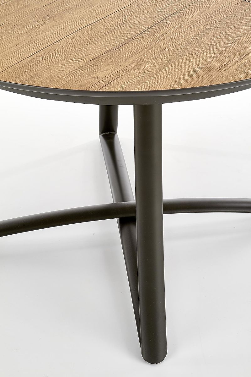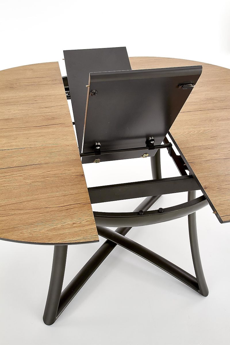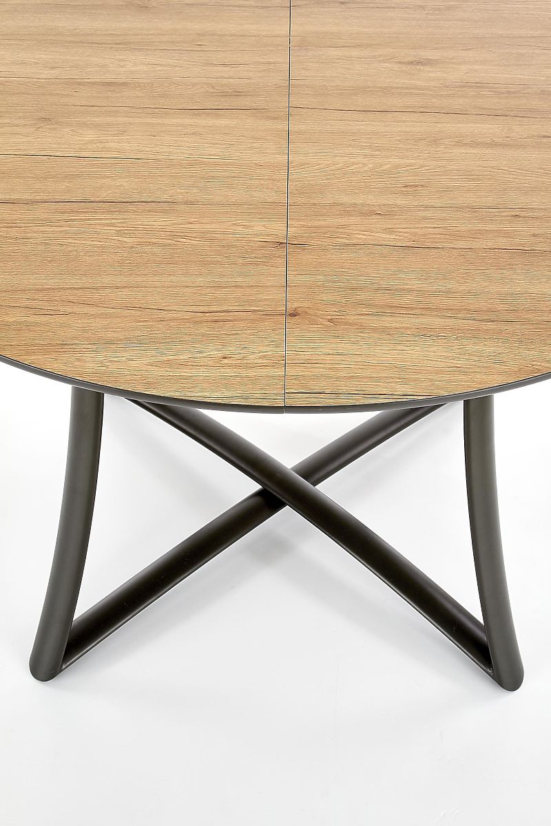 Blatul rotund al mesei este realizat din MDF cu furnir de stejar auriu, care imită fidel structura și textura lemnului natural. Inserția extensibilă de 30 cm în culoare gri cenușiu creează un contrast interesant și oferă mesei un aspect original.