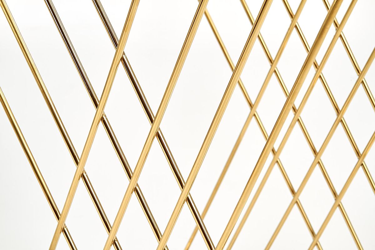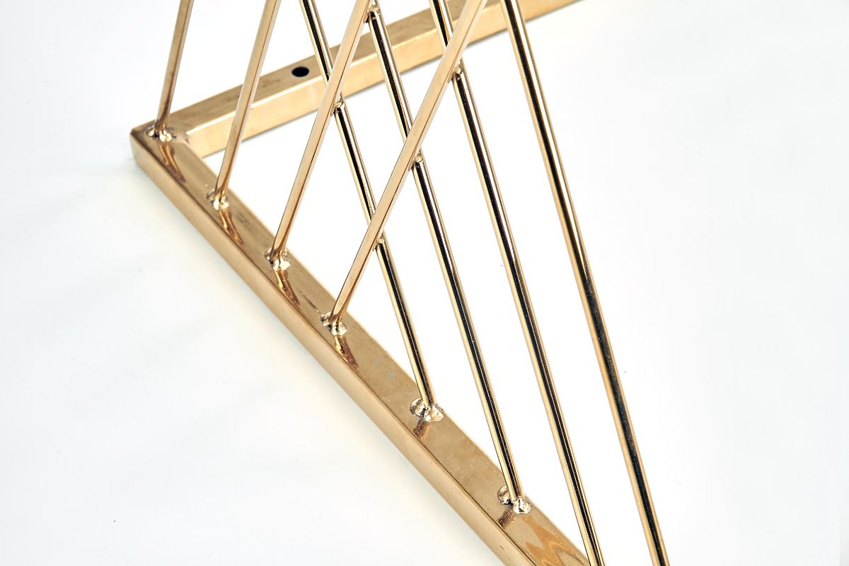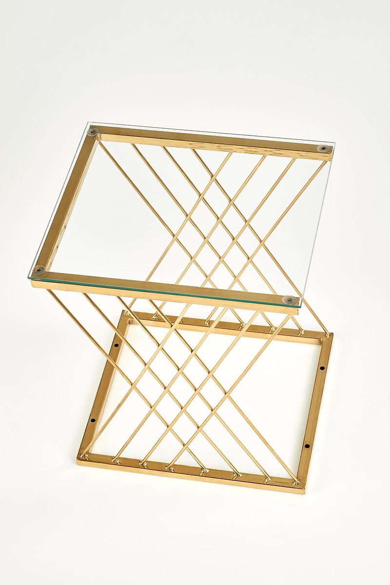 Baza cu formă originală, combinată cu blatul de sticlă transparentă, conferă măsuței un aspect ușor și elegant, care atrage privirea de la prima vedere. Îmbinarea otelului cromat în finisaj auriu cu sticla creează o impresie luxoasă și completează frumos interioarele moderne și glamour.