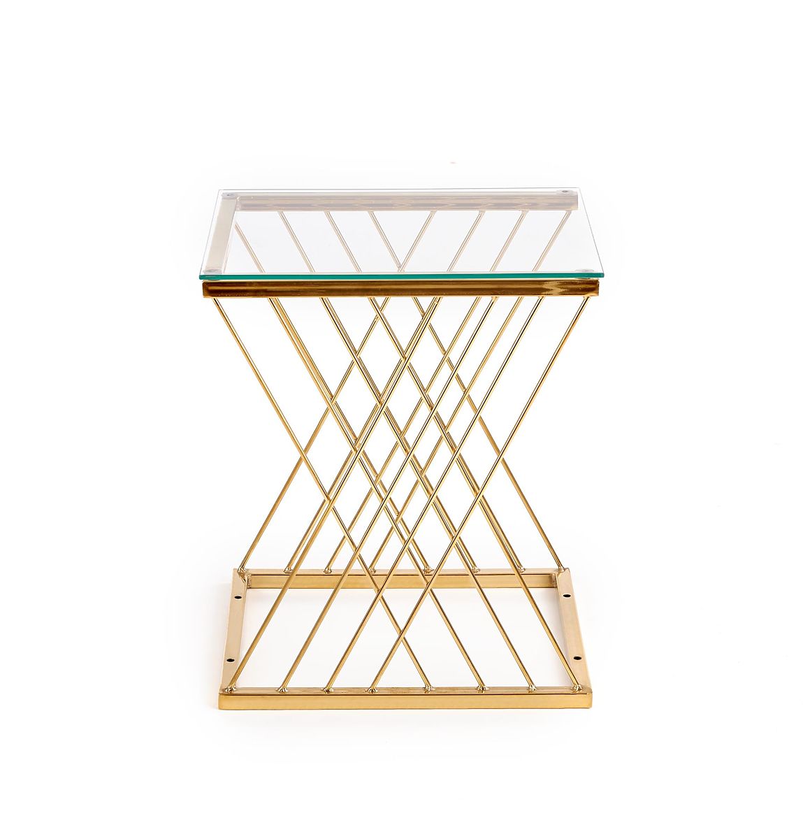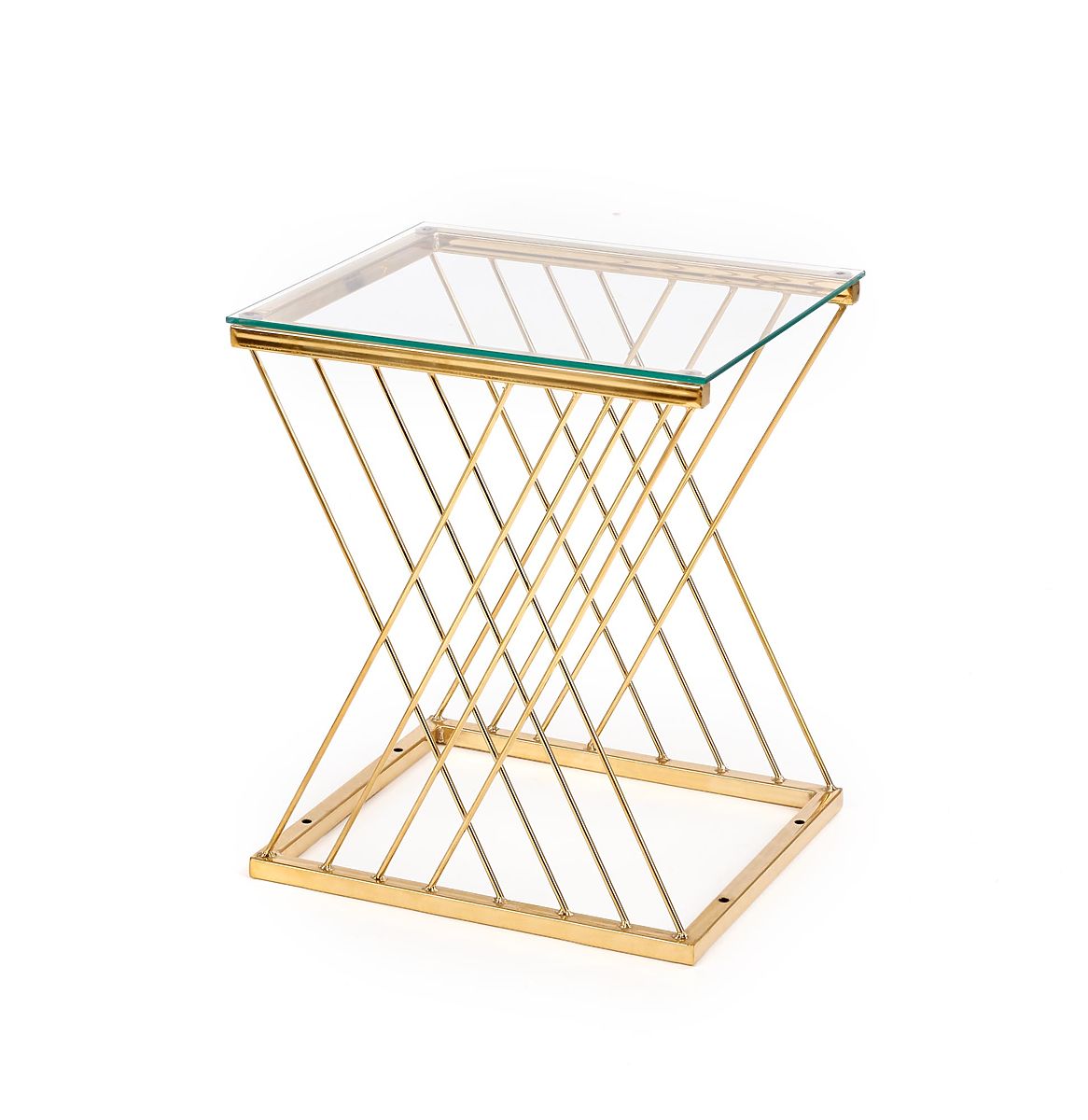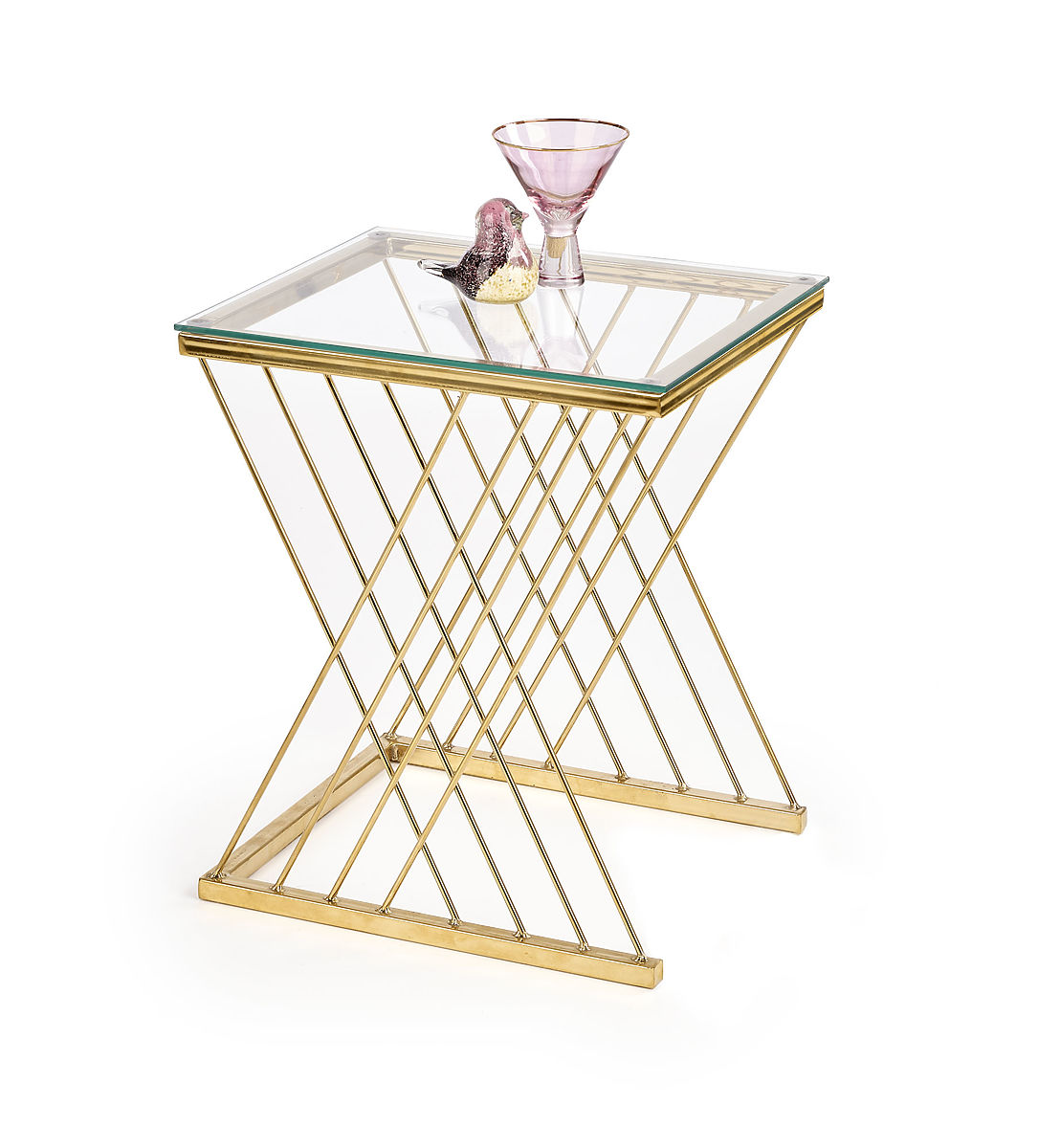 Baza cu formă originală, combinată cu blatul de sticlă transparentă, conferă măsuței un aspect ușor și elegant, care atrage privirea de la prima vedere. Îmbinarea otelului cromat în finisaj auriu cu sticla creează o impresie luxoasă și completează frumos interioarele moderne și glamour.