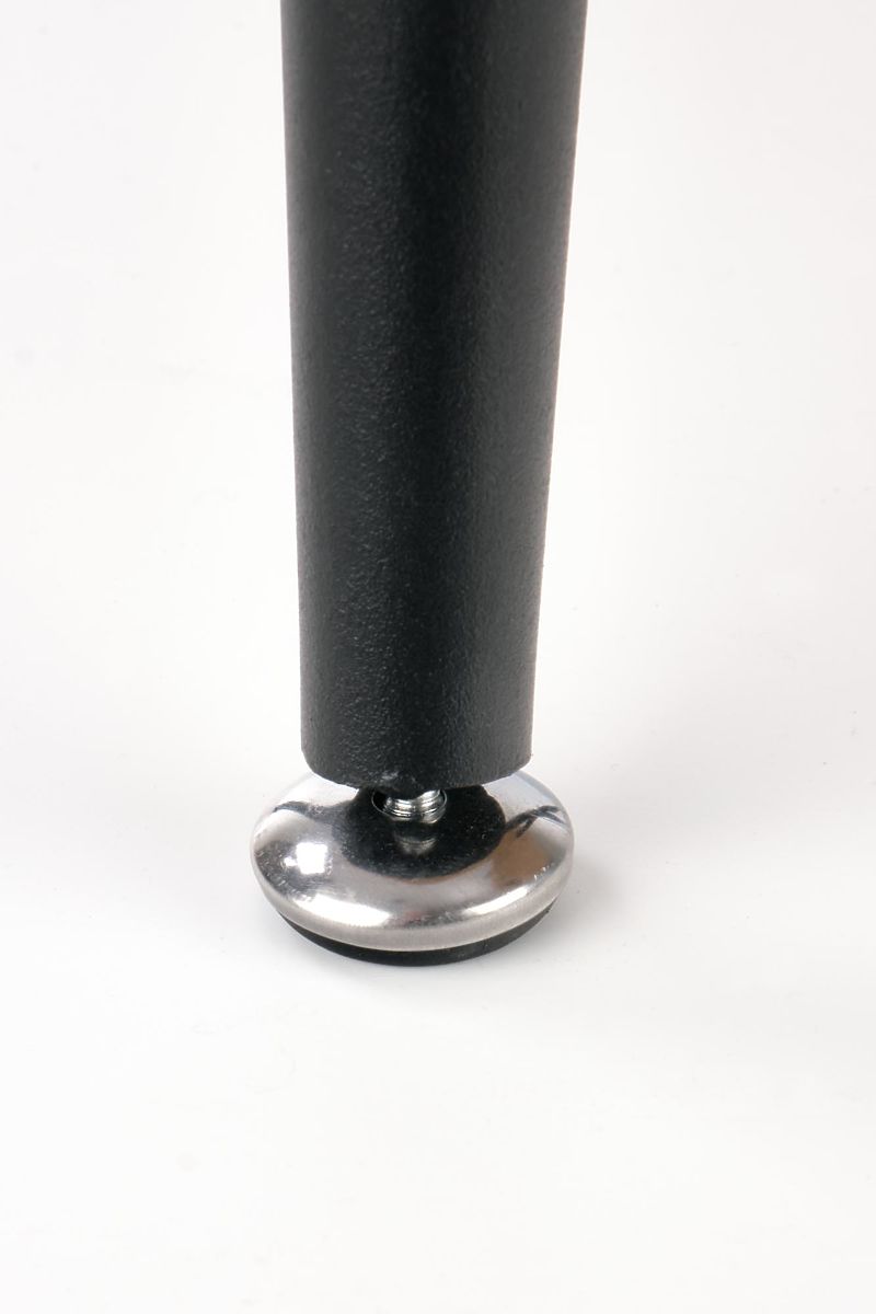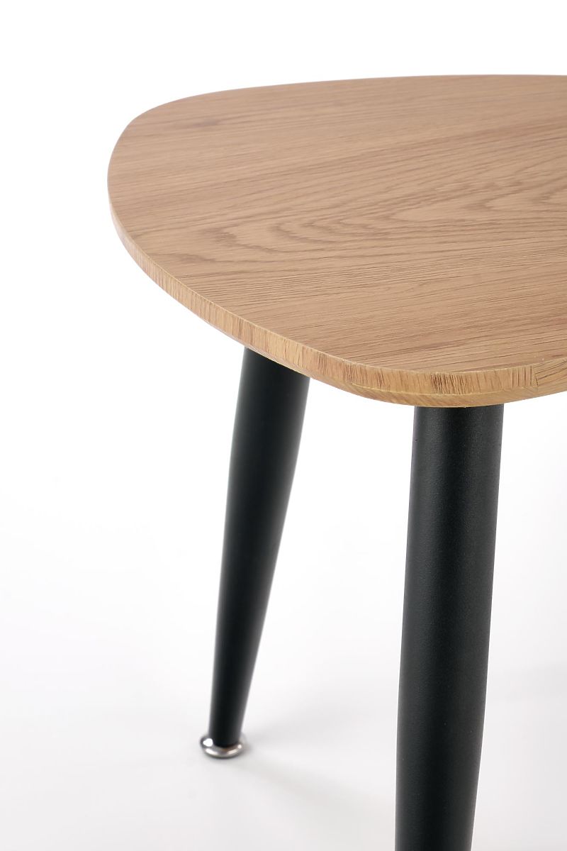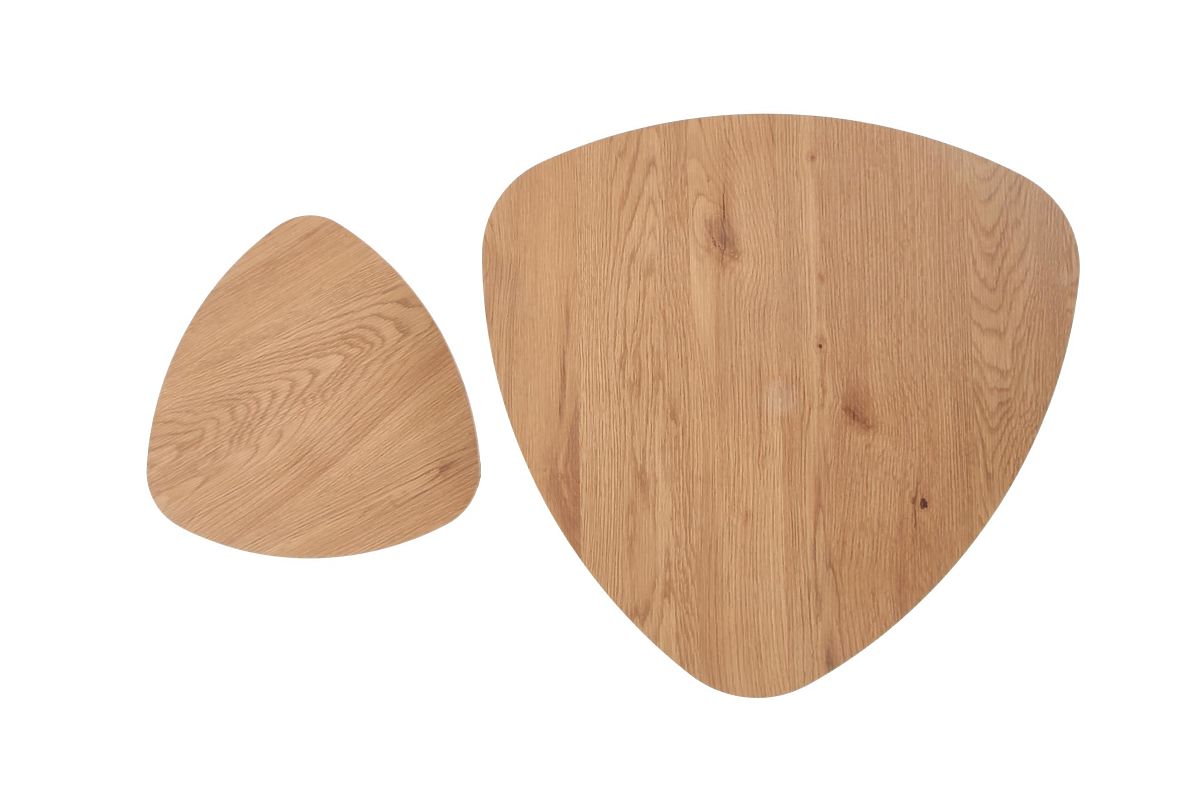 Stabilitatea este asigurată de trei picioare de oțel cu acoperire neagră prin pulverizare, care se îngustează ușor spre partea de jos, oferind meselor un aspect ușor și modern. Blaturile ovale din MDF furniruit cu un desen natural vizibil subliniază caracterul atemporal al întregului set.