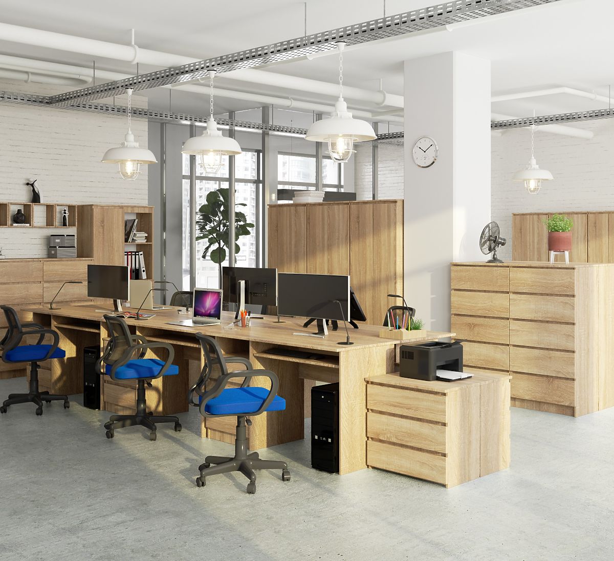 Birou de sine stătător! Partea din spate a biroului este finisată cu o placă laminată, ceea ce permite plasarea mobilierului în orice loc fără a fi nevoie să fie lipit de perete.