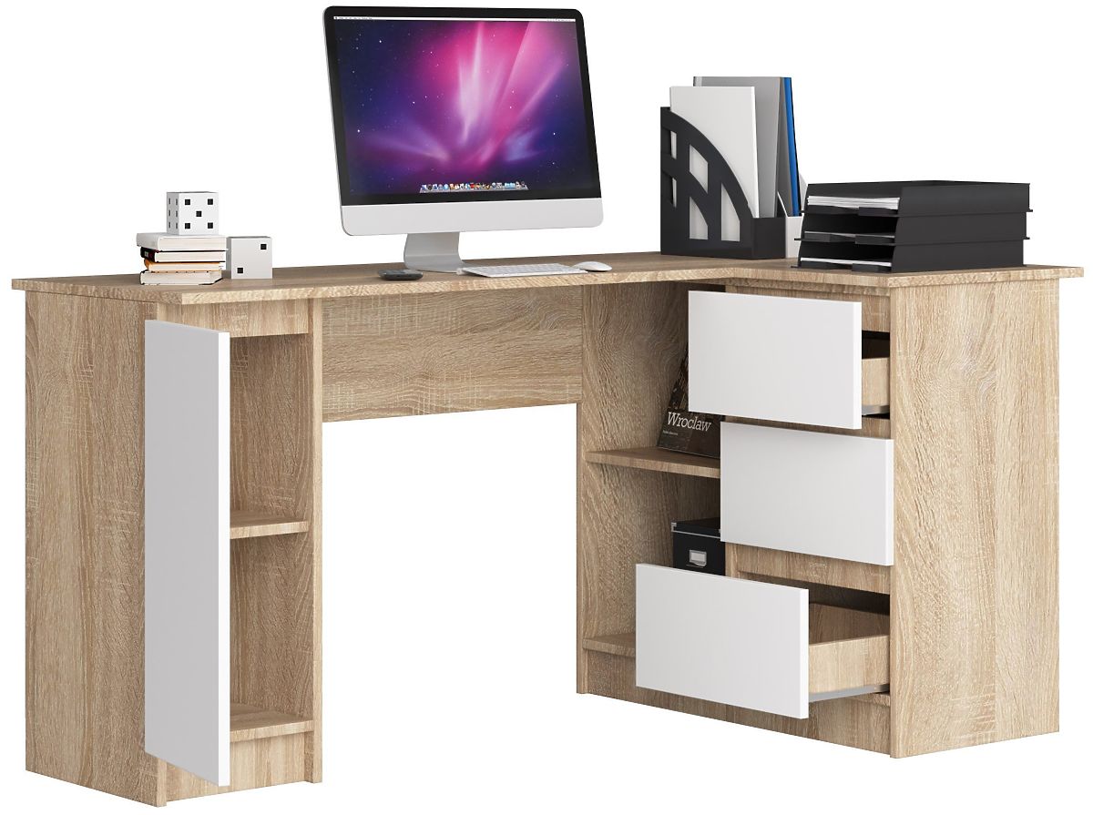 Biroul de colț B20 în nuanța unică de stejar Sonoma se potrivește într-un interior tradițional. Produsul este îmbogățit cu fronturi albe pentru ușile sertarelor și rafturilor și este destinat utilizării în colț. Are o înălțime optimă de 77 cm, care permite adaptarea locului de muncă la nevoile individuale. Dimensiunile mici și greutatea redusă a mobilierului permit montarea acestuia în orice loc. Biroul este fabricat din placă laminată de înaltă calitate de la firma Kronospan. Are rafturi și sertare practice care facilitează depozitarea chiar și a accesoriilor mai mari. În plus, sistemele de sertare sunt îmbogățite cu glisiere metalice cu role, care facilitează deschiderea și închiderea acestora. Pentru o mai bună protecție a marginilor, a fost utilizată banda ABS, care previne deteriorările mecanice. Biroul este livrat demontat pentru asamblare proprie. Pachetul include și un ghid practic de utilizare și o garanție de 2 ani a producătorului, care protejează mobilierul achiziționat.