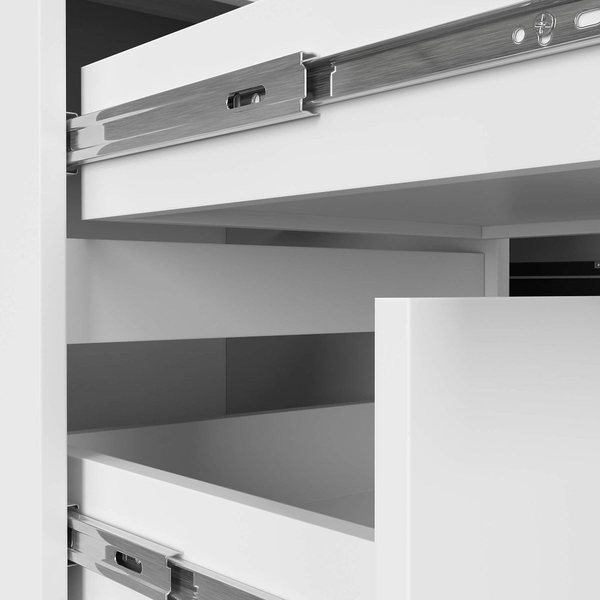 - Sertarele se deplasează pe ghidaje metalice cu bile