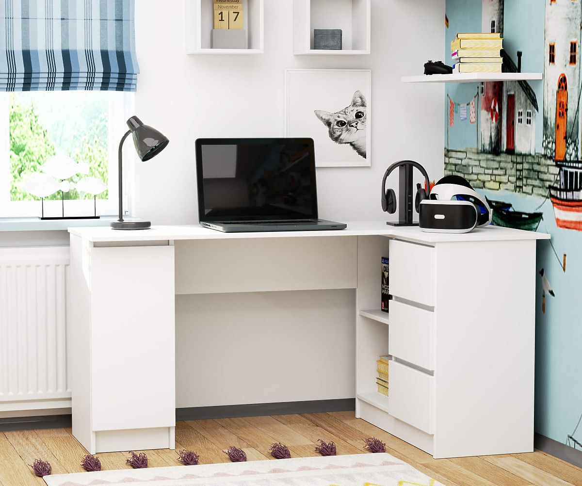 Masă de colț albă pentru calculator cu sertare și dulap - B20