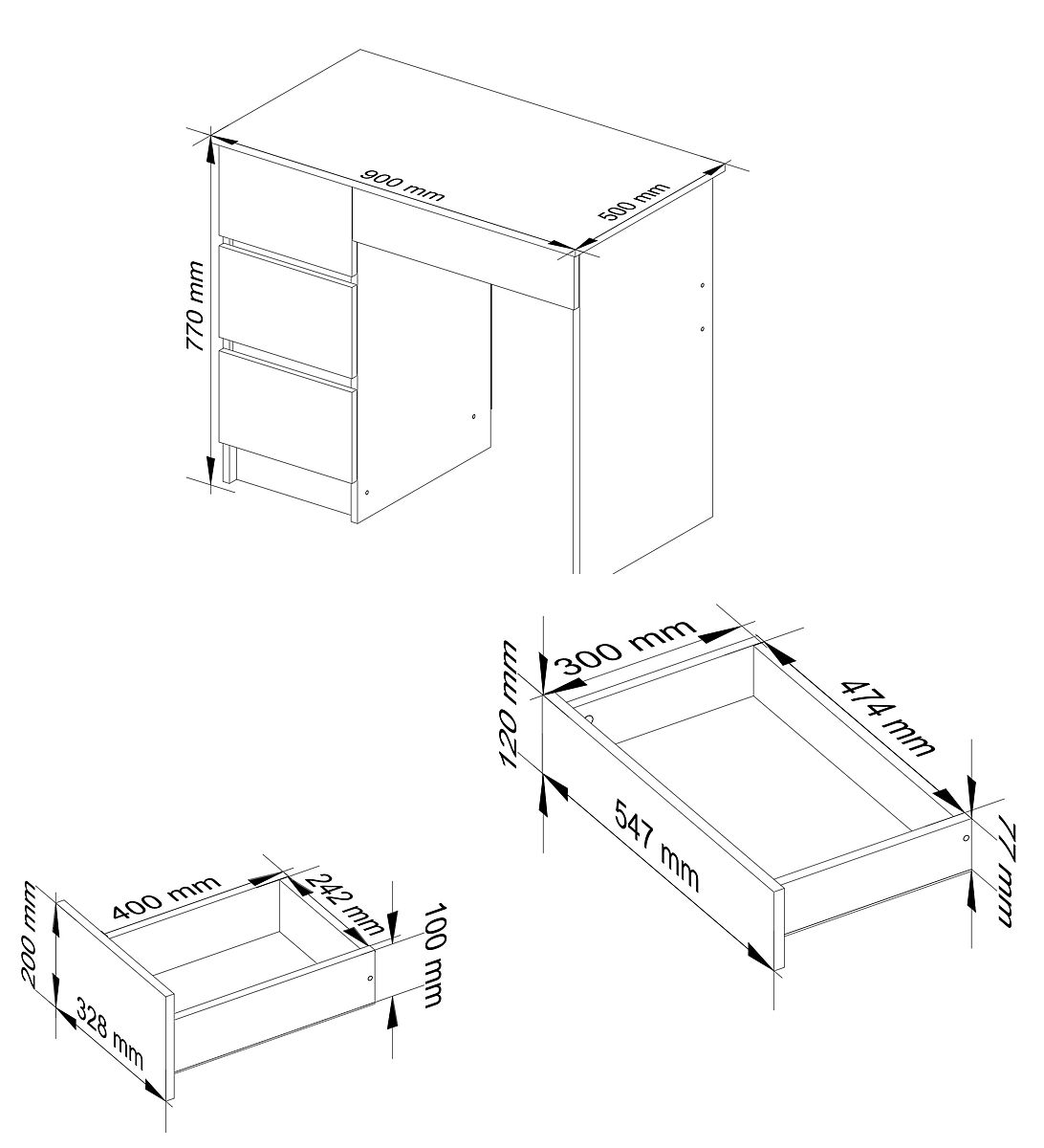 Biroul are o lungime de 90 cm, o înălțime de 77 cm și o adâncime de 50 cm. Este fabricat din placă laminată cu grosimea de 16 mm, care are o rezistență ridicată la abraziune. În plus, are un raft pentru tastatură, care, la fel ca sertarele, se mișcă pe ghidaje metalice cu bile. Acest lucru garantează o mișcare lină la extindere, iar sertarul poate fi ușor îndepărtat dacă este necesar. Marginile biroului sunt acoperite cu o margine ABS, care protejează împotriva deteriorărilor mecanice și a altor zgârieturi.
