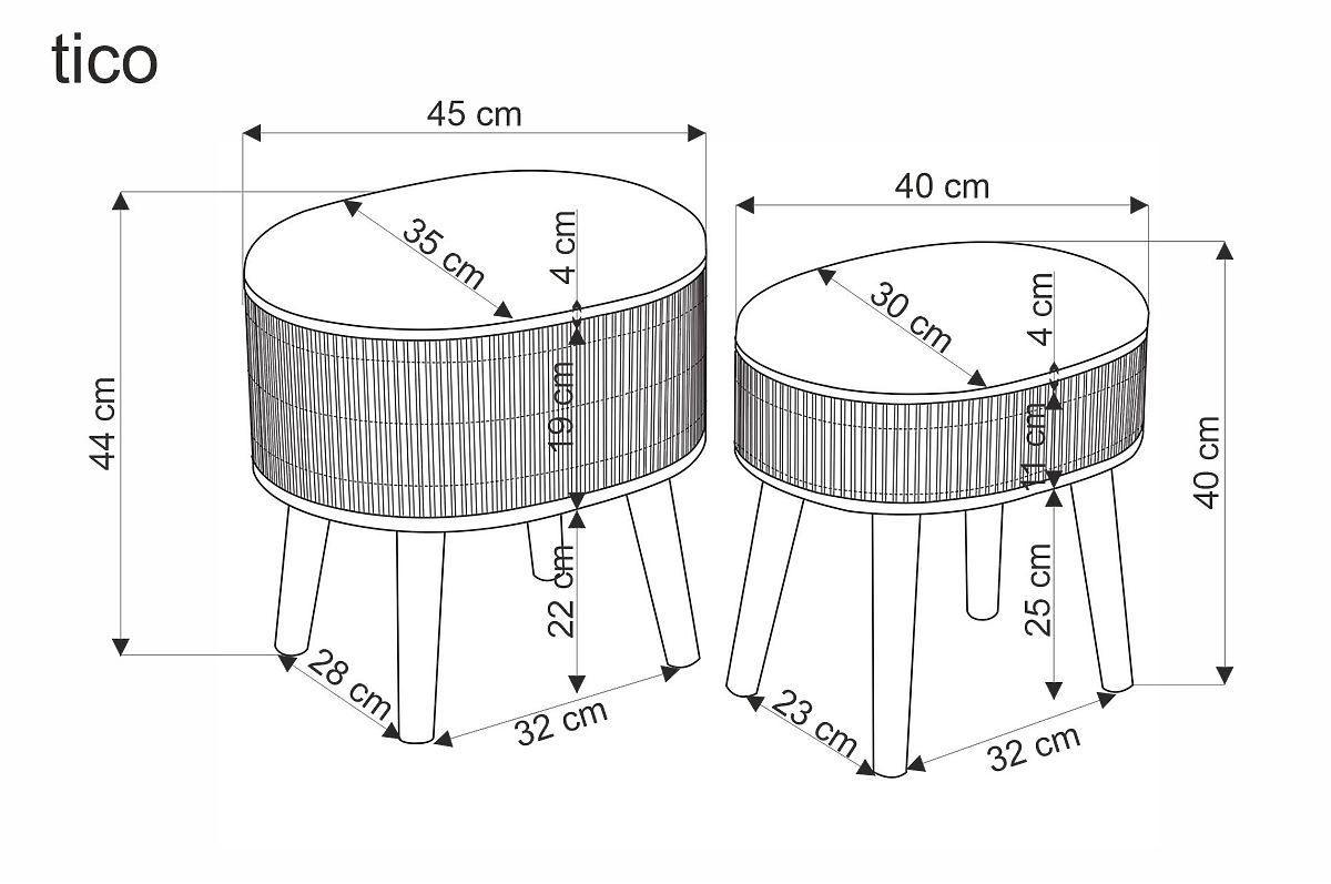Setul de două taburete TICO reprezintă o soluție elegantă și practică pentru interioarele moderne și confortabile. Datorită formei sale ovale delicate, lemnului natural și tapițeriei bej, are un aspect armonios și atemporal, devenind ușor un accesoriu stilat pentru camera de zi, dormitor sau hol. Taburetele sunt tapițate cu material plăcut de culoare bej, care adaugă căldură și moliciune spațiului. Construcția stabilă din lemn masiv de cauciuc în finisaj natural asigură rezistență și durabilitate îndelungată. Fiecare taburet este echipat cu un spațiu de depozitare practic, ideal pentru păstrarea păturilor, pernelor, obiectelor mici sau accesoriilor de casă. Datorită dimensiunilor diferite, taburetele pot fi utilizate separat sau combinate practic în funcție de nevoile actuale. Sunt excelente ca locuri de ședere suplimentare, suport pentru picioare sau elemente decorative ale interiorului. Sunt livrate demontate pentru o manipulare ușoară.