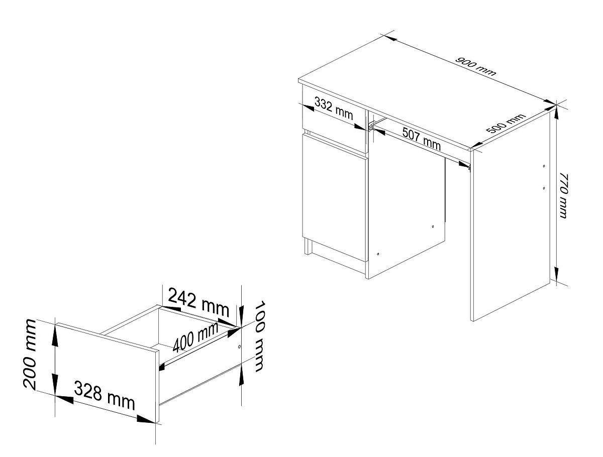 Biroul de calculator PIKSEL este fabricat din placă de mobilier laminată în două culori. Corpul și blatul mobilierului și panoul din spate sunt albe, în timp ce fața sertarului și a dulapului este gri grafit. Toate suprafețele mobilierului sunt mate. Partea de lucru se află pe partea dreaptă a biroului, unde sub blat este atașat un sertar extensibil pentru tastatură. Partea stângă a mobilierului este complet închisă. Direct sub blat este un sertar și mai jos - un dulap cu uși, echipat cu două rafturi. Atât sertarul, cât și raftul pentru tastatură se extind datorită șinelor metalice.