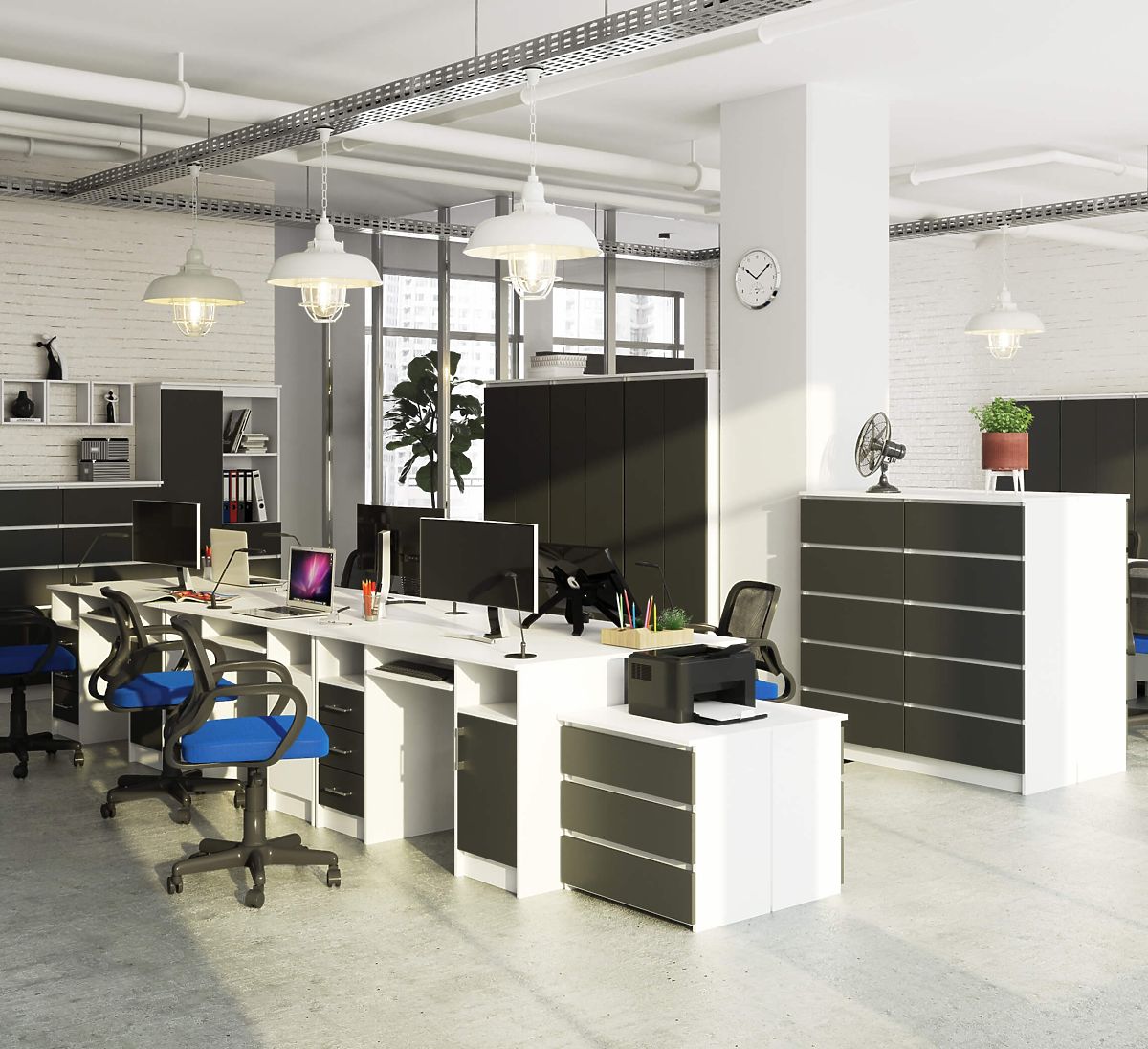 Biroul pentru computer ANA de 124 cm, datorită combinației clasice de alb și gri grafit, se integrează ușor în orice interior. A fost proiectat având în vedere spațiile de birou și studiourile. Este potrivit și pentru camera unui adolescent. Pe blatul biroului este mult spațiu – puteți plasa un monitor și alte obiecte de lucru necesare după cum este nevoie. Pentru tastatură există un raft extensibil separat. Biroul oferă mult spațiu pentru organizare: două nișe, trei sertare și un dulap cu raft. Întreaga construcție este realizată din placă laminată, ușor de întreținut și rezistentă la abraziune. Biroul ANA este eleganță, funcționalitate și soliditate într-unul.