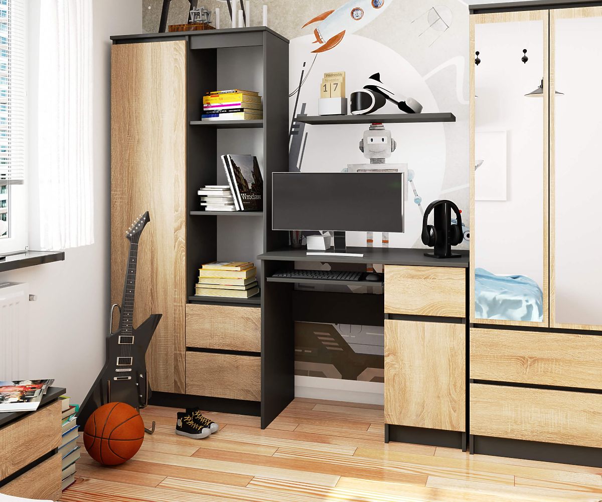 Masa independentă PIKSEL de 90 cm în culorile GRI GRAFIT/STEJAR SONOMA este soluția ideală pentru interioare mici. Este foarte utilă ca masă de școală sau de calculator. Construcția sa ergonomică asigură confortul în utilizare. Masa este echipată cu un raft extensibil pentru tastatură, un sertar lateral practic și un dulap cu raft, în care pot sta liber dosare și cărți. Pentru fabricarea mesei s-a folosit un blat mat plăcut la atingere și ușor de întreținut, acoperit cu un strat rezistent de laminat. Întregul este completat de mânere practice de culoare argintie.