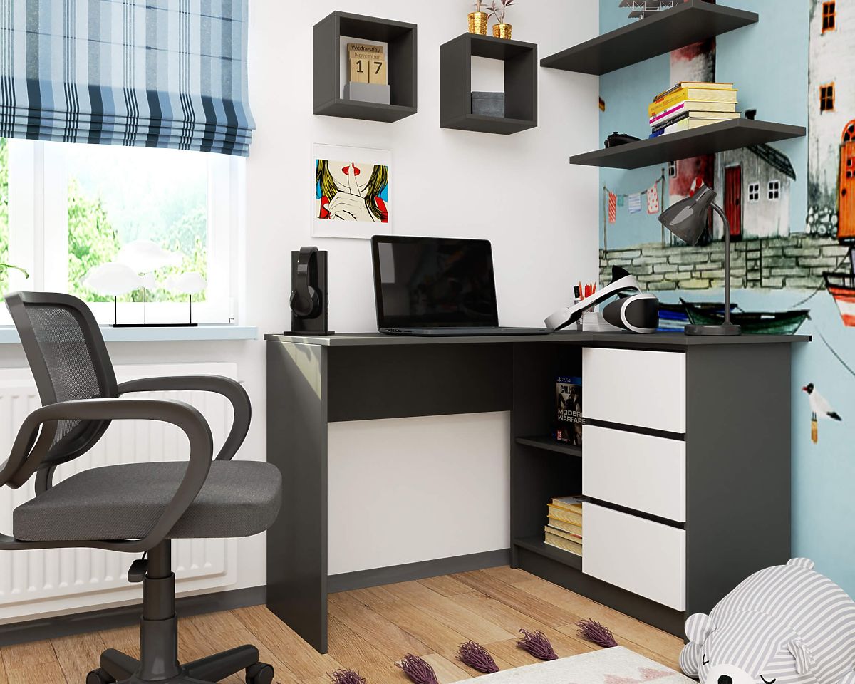 În case, apartamente și birouri, mesele de colț sunt din ce în ce mai des întâlnite. Nu doar că sunt la modă, dar și funcționale. Persoanele care caută mobilier în nuanțe de gri cu fronturi albe pot alege masa de colț B16 cu lățimea de 124 cm. Este ideală pentru studiu sau activități de lucru și are un aspect modern. Include rafturi și sertare în care pot fi plasate documente, cărți, rechizite de birou și multe altele. Mobilierul se remarcă prin durabilitate. Este destinat montajului individual, ceea ce nu este dificil, deoarece fiecare comandă include un manual de instrucțiuni.